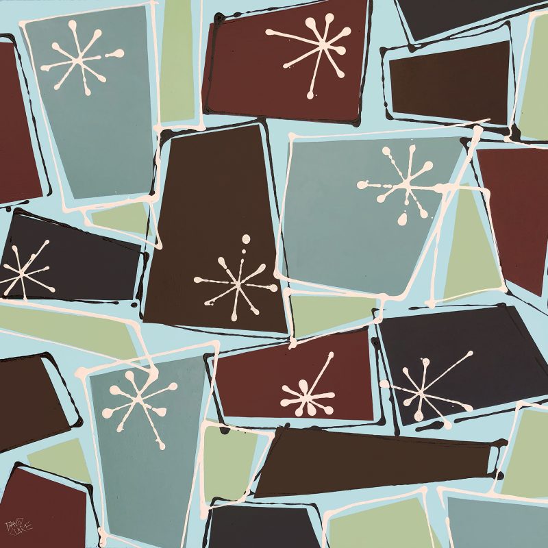 Acrylic and spray paint on book pages on stretched canvas
