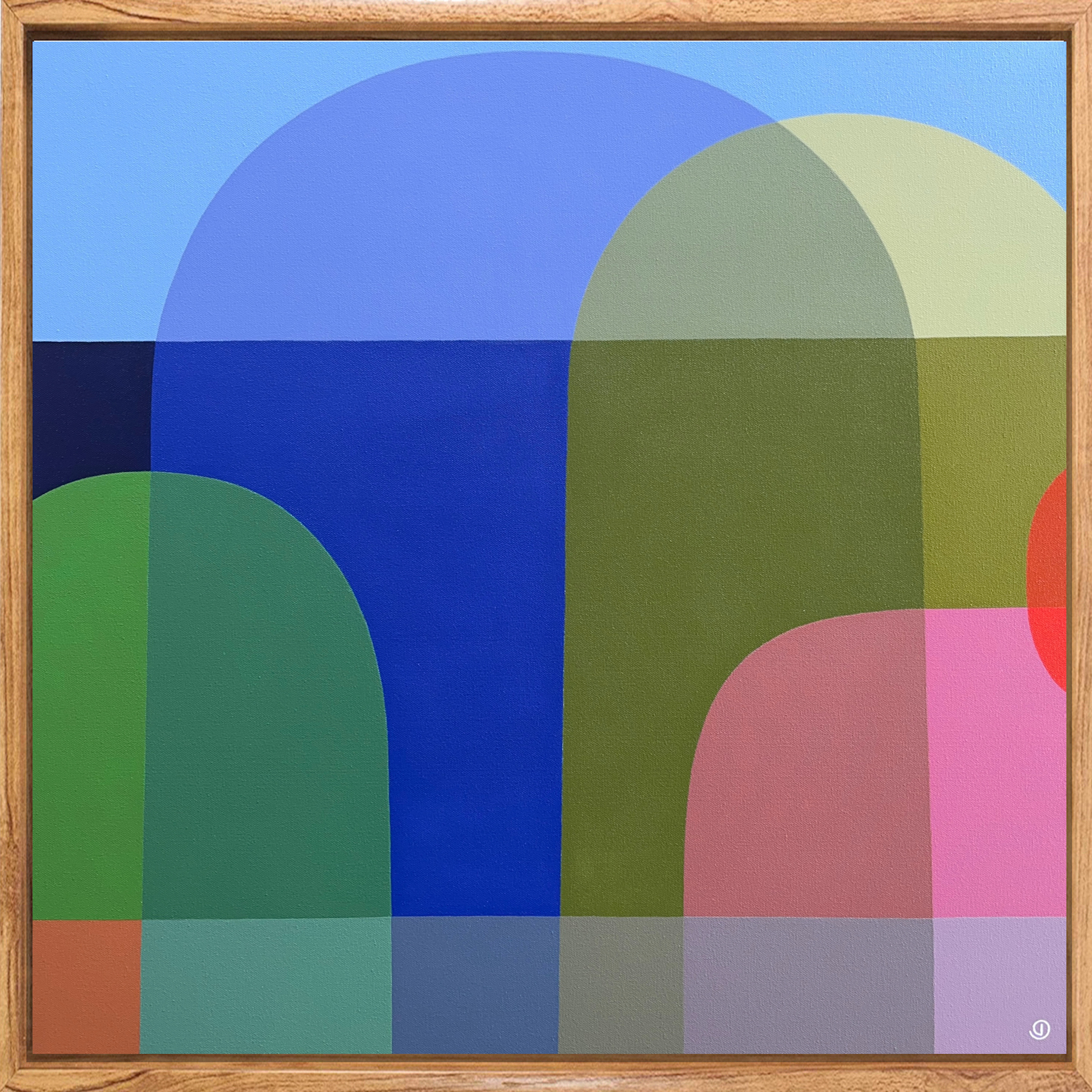 Peninsula Way is inspired by the coastal landscapes of the Victorian peninsula. In her current series of abstract landscapes, Charlotte interprets forms from nature (rainbow arcs, rock formations, seaside horizons, rising tides etc) in a hard-edged style and explores layering and juxtaposing vivid colour, experimenting with ideas of transparency and solidity to evoke a sense of joy, light and equilibrium.
