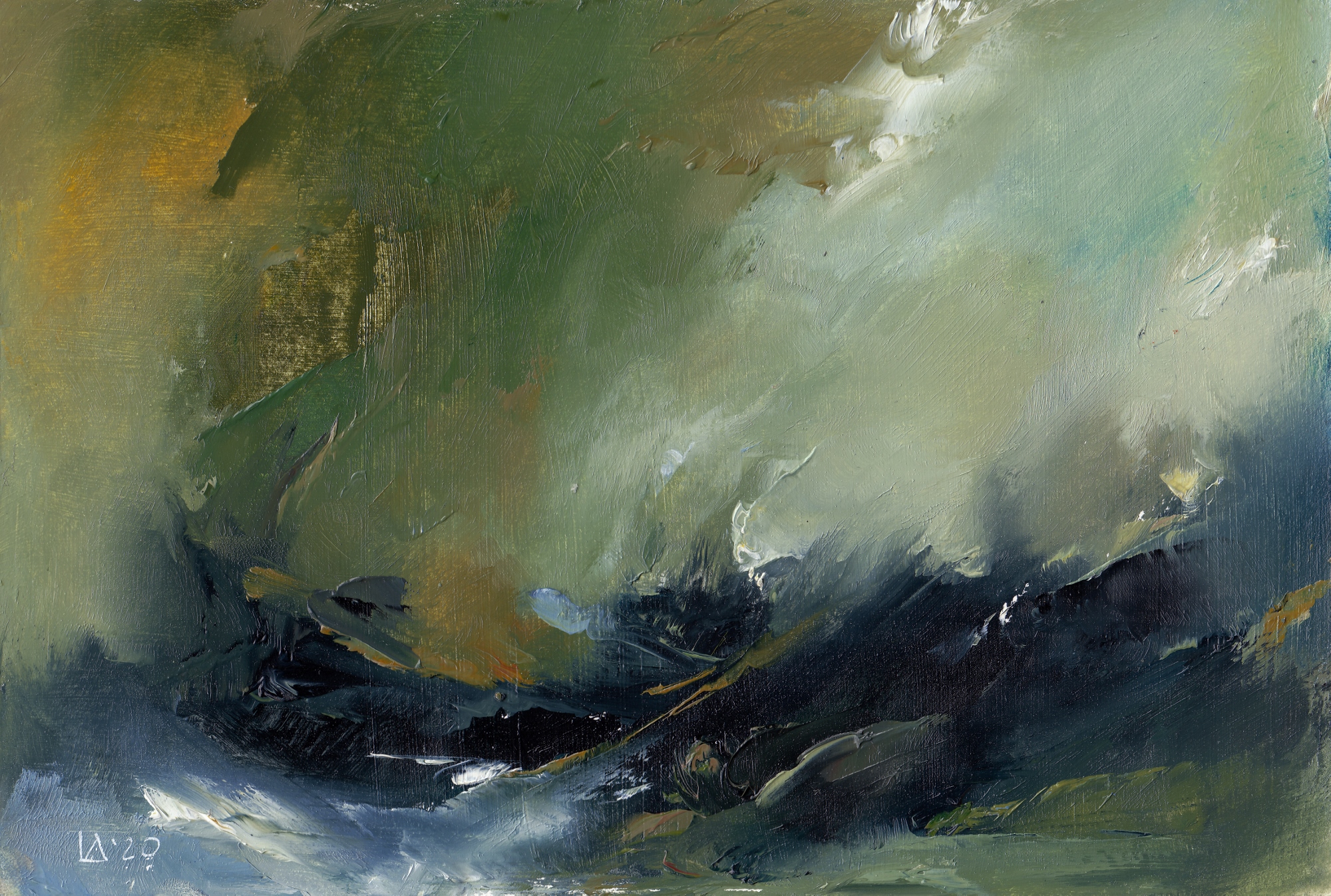 Perilous Shore – I love the idea of an angry foaming sea in the midst of a storm. The power of waves crashing into rocks at the shore is awe-inspiring, and for a Sydney-sider such as me, something I tend to see more often than not. There’s a culmination of factors that draw me, including the loss of colour saturation as the day gets darker, and the movement of the sea and sky while the rocks stand immovable…I’ll never get tired of painting these scenes.
