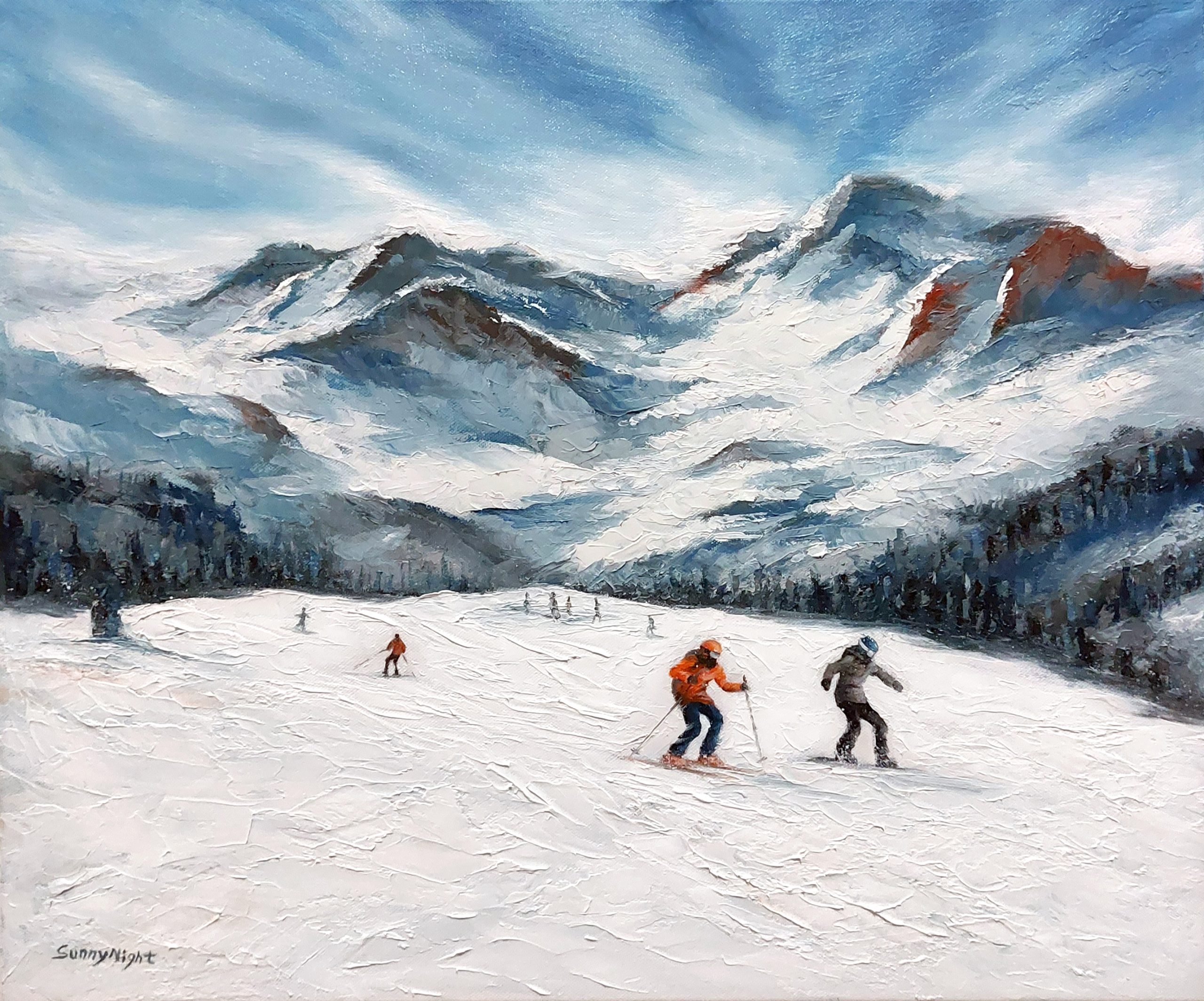 Impasto oil paint snow mountains skiing with palette knives & brushes. Inspired by snow trips to Perisher Valley, Blue Cow Mountain, NSW Australia. The canvas is 3.5cm deep, hanging wire installed, edges are painted. Signed on the front.