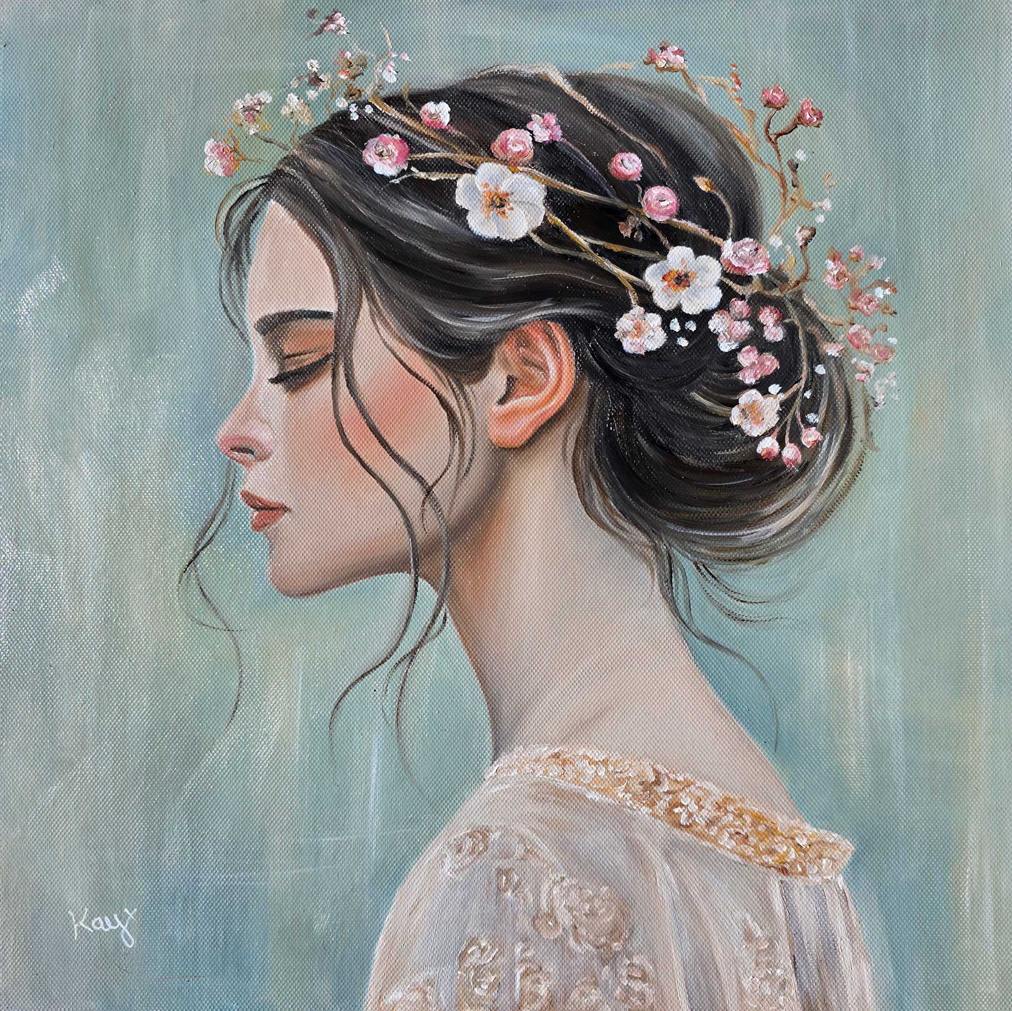 She carries the hush of spring in her soul—gentle, tender, quietly blooming. In the stillness, she remembers who she is: not loud, but luminous. Adorned in delicate blossoms, she listens not to the world’s noise, but to the soft knowing within. This piece is about grace found in quiet places, and the quiet strength that never asks for permission to blossom.