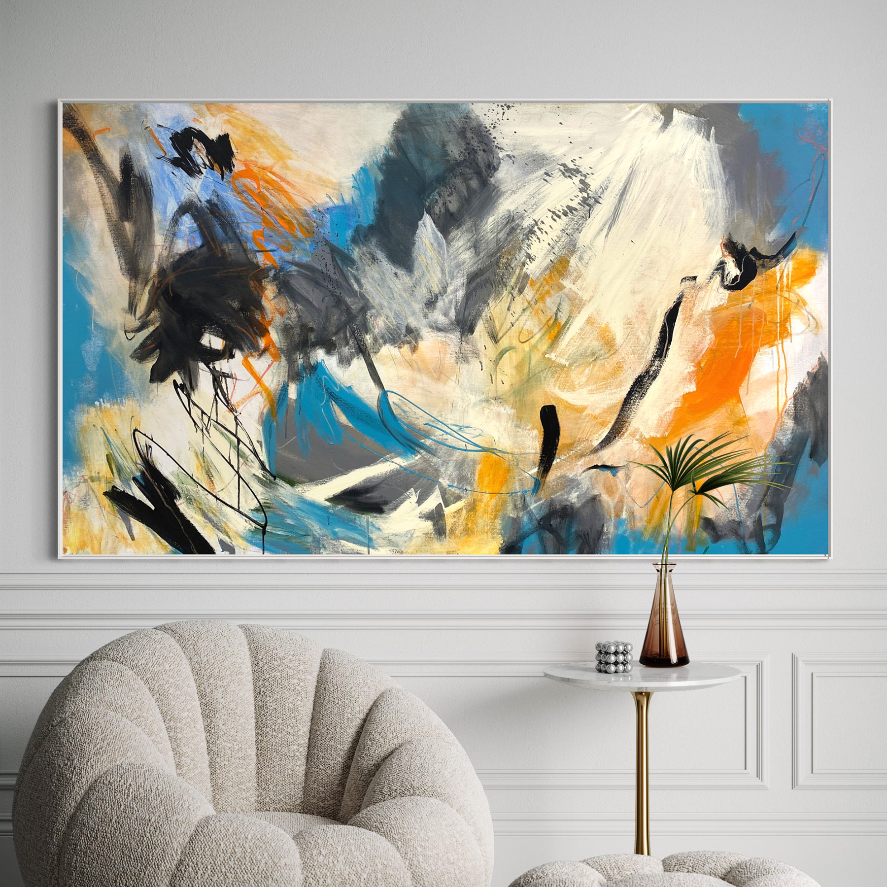 The energetic mark making pops when combined with this striking palette of apricot, orange, peach white and neutral tones of beige, cream mixed with light blue, grey and black.