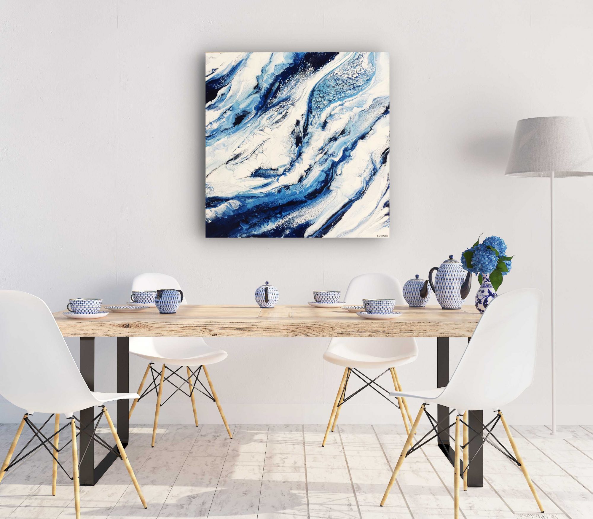 Quality acrylics used giving long lasting rich pigmentation/lustre. Designed on acid free environmentally unbleached cotton duck, triple coated with universal primer, gallery style folded corners, heavy duty stretcher bars to reduce warping. Protective Varnish applied to protect work. As with any “Poured Acrylic” work, the colour has extended down each side of the canvas. The surface of the painting has a slight textured surface encouraging the viewer to touch and feel the art.
