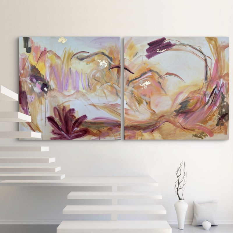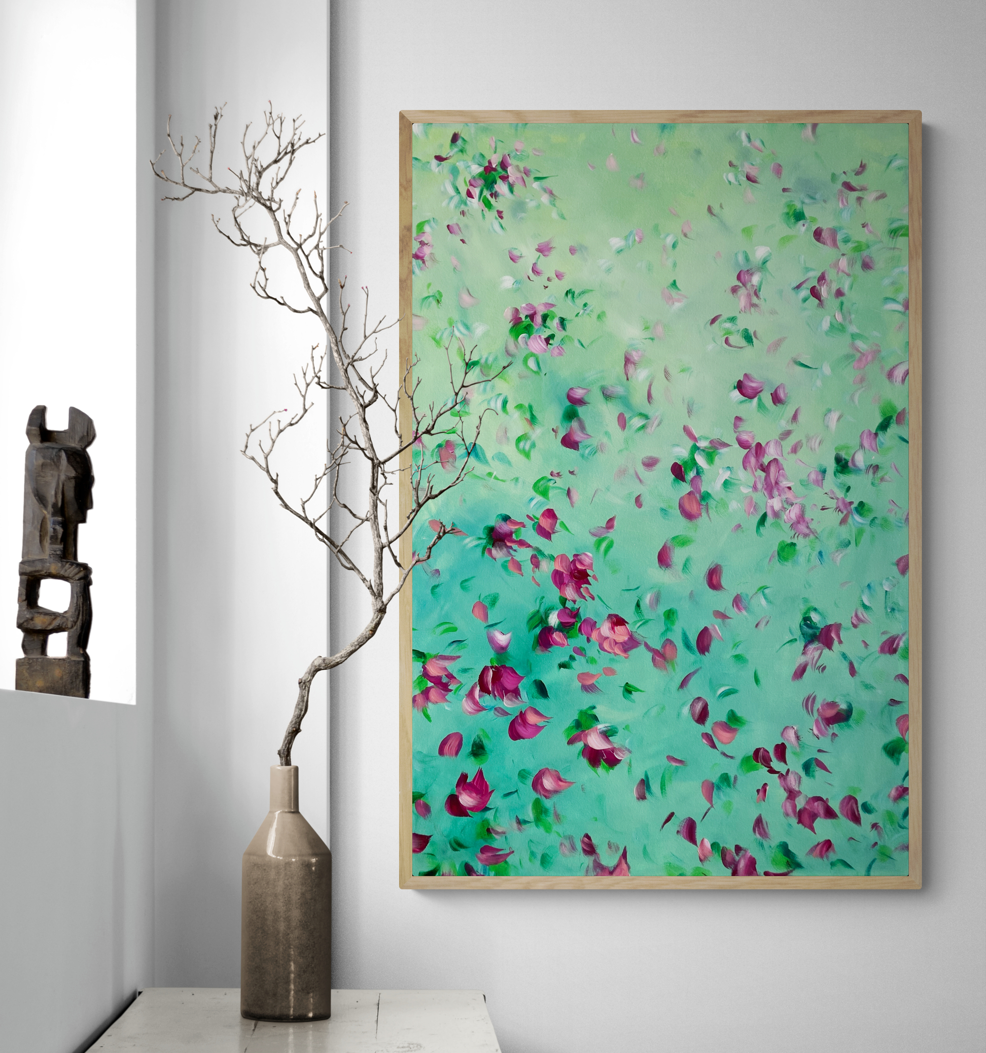 Petals chase around the canvas in this abstract floral work that celebrates the joy of flowers every day.