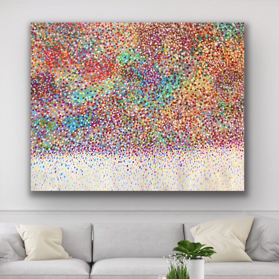 My painting Petals of Love is a composition of colours and rhythms of petals dancing in the sky . An explosion of petal colours in the sky swept by the winds creating fireworks in the sky. Capturing the beautiful colours of the Rainbow petals falling onto the landscape . The background colour is mother of pearl white.This painting is painted with Acrylic paints. The painting is signed and dated 2020 at the back and comes with a certificate of Authenticity.