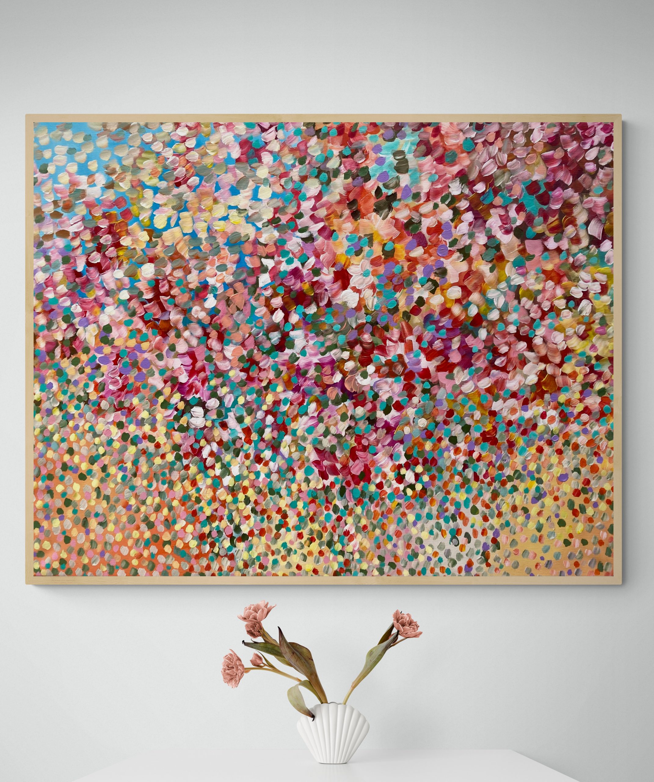 Petals of Romance is a painting with lots of layers of paint and movement creating so much depth to the painting. Beautiful flickering petals fill the landscape like fireworks creating a palette of colours of the Forest. I tried to capture the beautiful rhythms of the petal movements swept by the winds creating a beautiful dance ,flickering like stars over the landscape .A veil of petals covering the whole landscape creating this explosion of colours. Beautiful rich colours of reds , orange and yellows , pinks, pastels, blues and purples make it a very warm painting. Hope with this work it makes the viewer feel very peaceful and tranquil. The painting is signed and dated 2021 at the back and comes with a certificate of Authenticity.