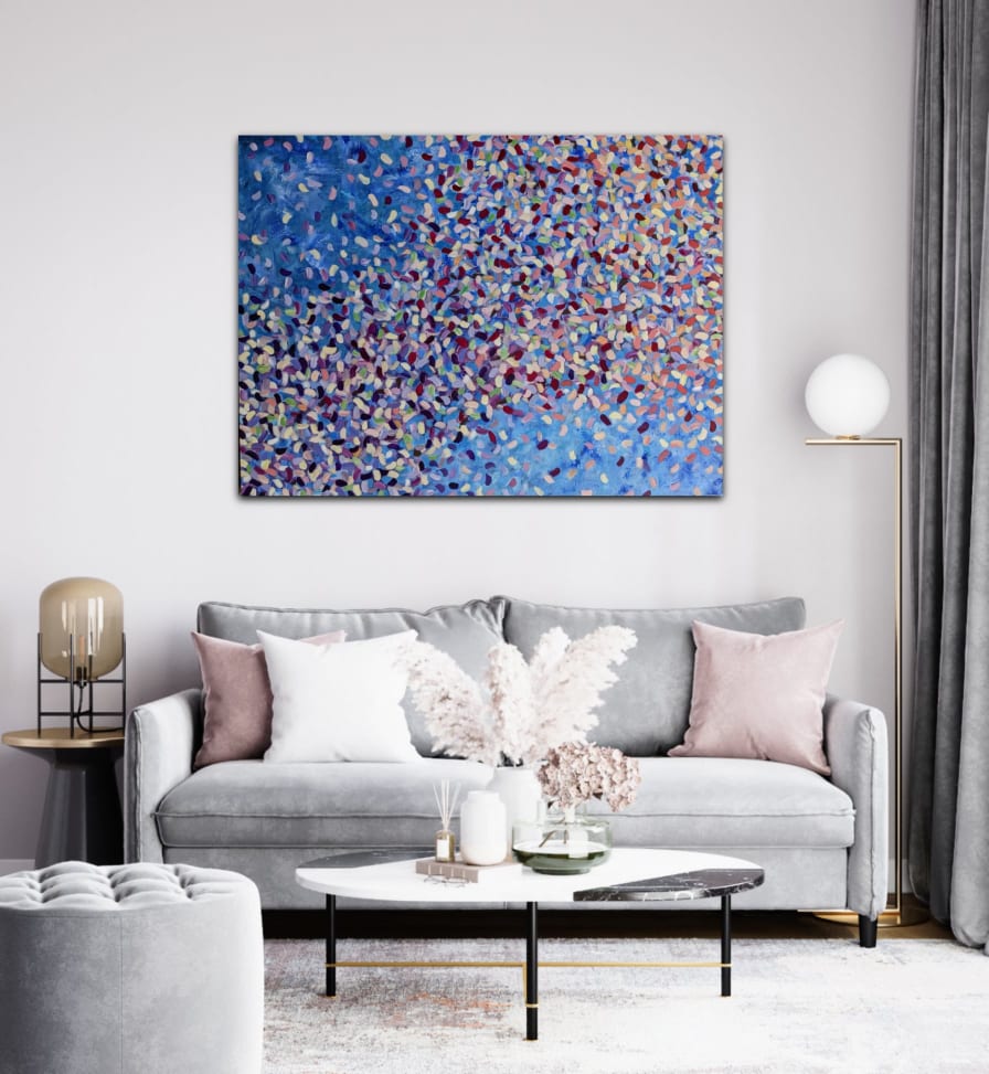 My garden is full of beautiful flowers, of all colours. I love to see how petals are intermingling when they fall. This is an abstract painting in high quality acrylic paint, done on professional canvas. The canvas is 7 cm thick, the frame is heavy and sturdy, the edges are painted crisp white.