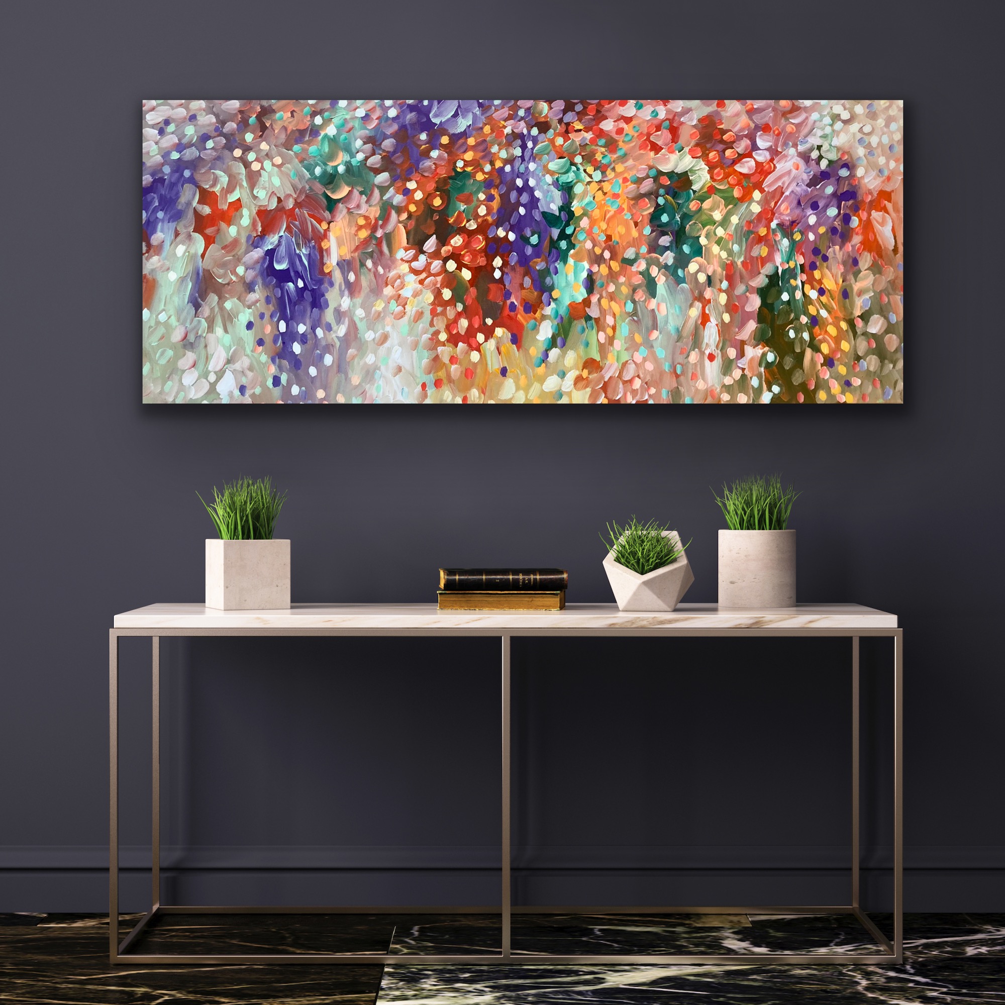 Petals of the Heart by Theo Papathomas a painting with beautiful warm and cool colours of the trees and petals flying in the wind falling over landscape. Petals weeping onto the landscape creating this beautiful veil of colours covering the whole landscape . A composition of rich colours and rhythms of petals dancing over the landscape like musical notes. A very peaceful and tranquil painting with so much depth . This painting is painted on canvas.The painting is signed and dated 2021 at the back and comes with a certificate of Authenticity.