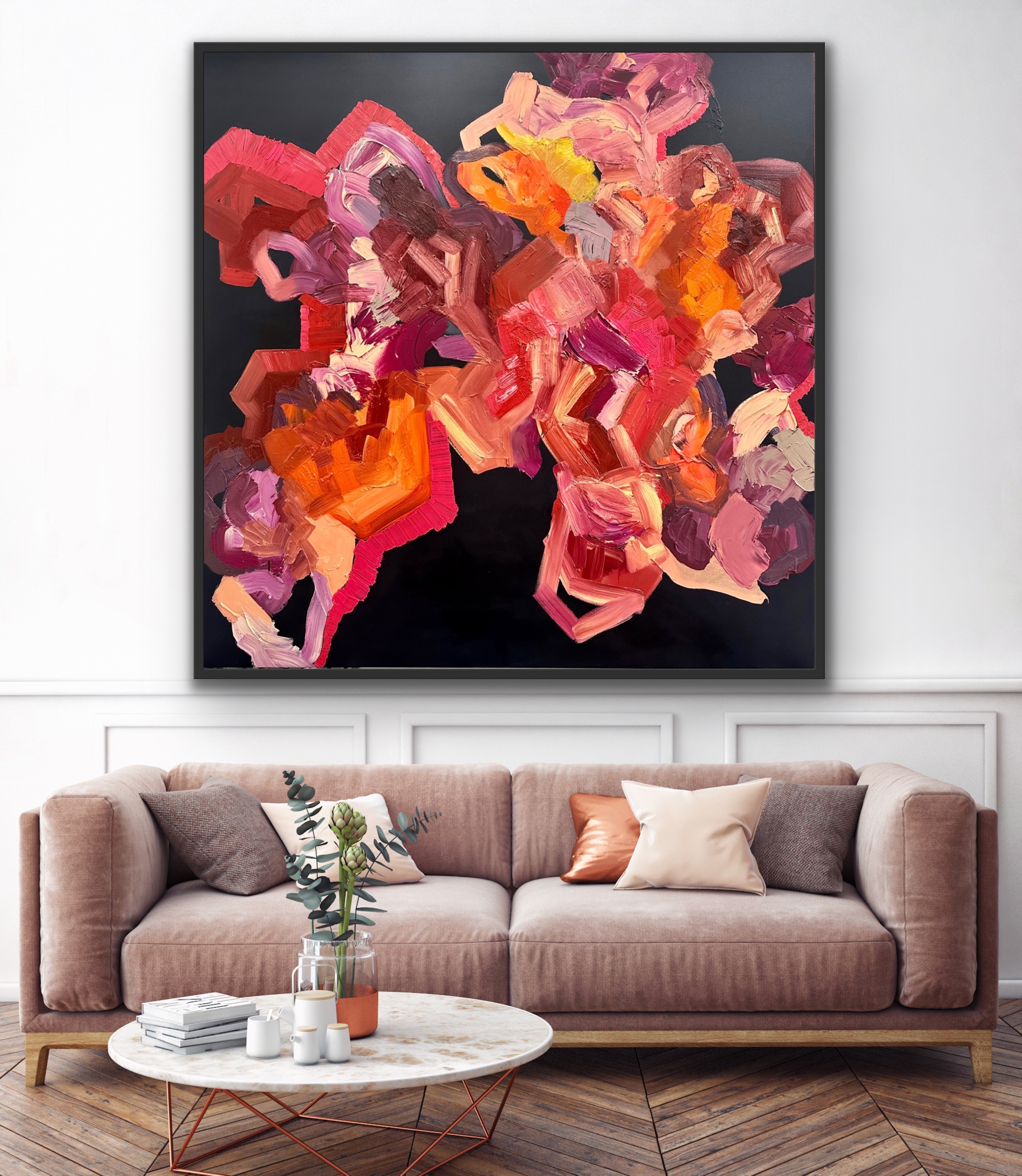 Oil on stretched canvas. 130x130cm FRAMED in a Charcoal ash gallery shadow box frame