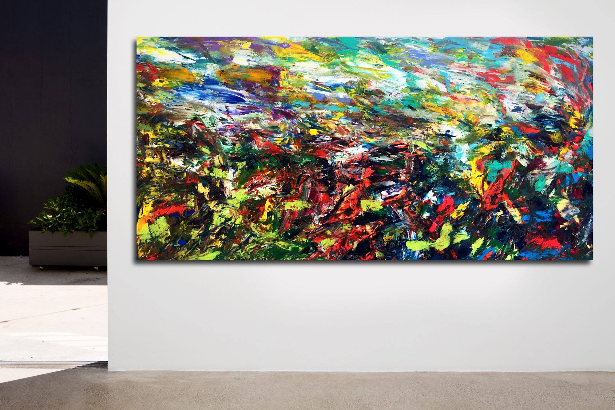 This work is painted on 12 oz gallery canvas and has been sealed with varnish. The canvas is hand stretched onto a frame is 200 cm in width by 98 cm in height.