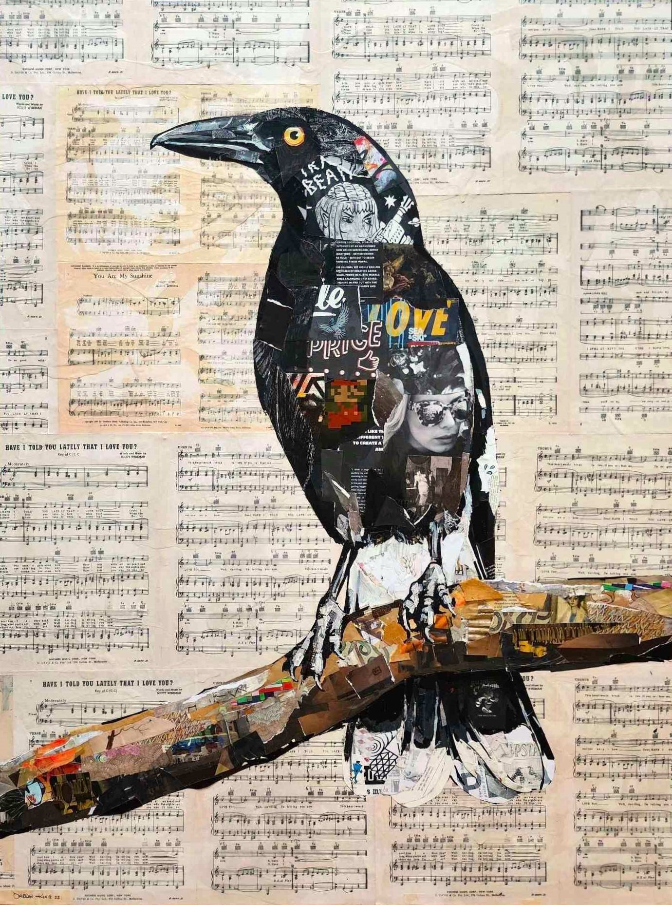 The background is made from printed copies of vintage music sheets, ‘Have I Told You Lately That I Love You’ and ‘You Are My Sunshine’. Other elements have been harvested from various discarded magazines, books, junk mail, maps and brochures. The layered paper along with the adhesive brings a nice textural quality to the work. Abstract colour and shapes combine up close, that come together a few steps back.
