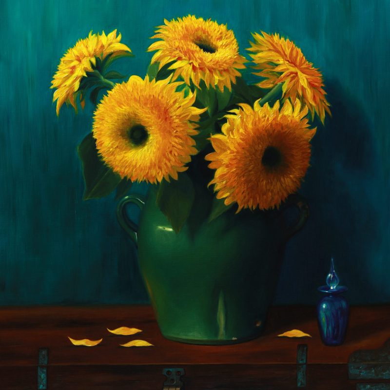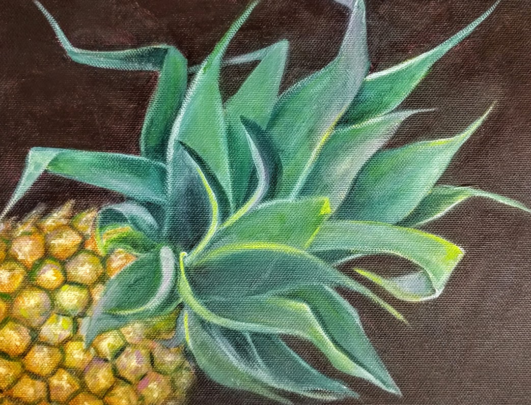 Pineapple Please by Cathy Gilday – This still life is the second of my new fruit series. I love the intestesting patterns of the skin and the fabulous spikey leaves that crown the fruit, not to mention it’s delicious flavour! I have laid the pineapple on it’s side to make an interesting composition and purposely set the pineapple on a stark red black background, making it stand out in a rather elegant way. So far, the others in this series are of pears and a rambutan. Artists quality paints, mediums and varnish used.
