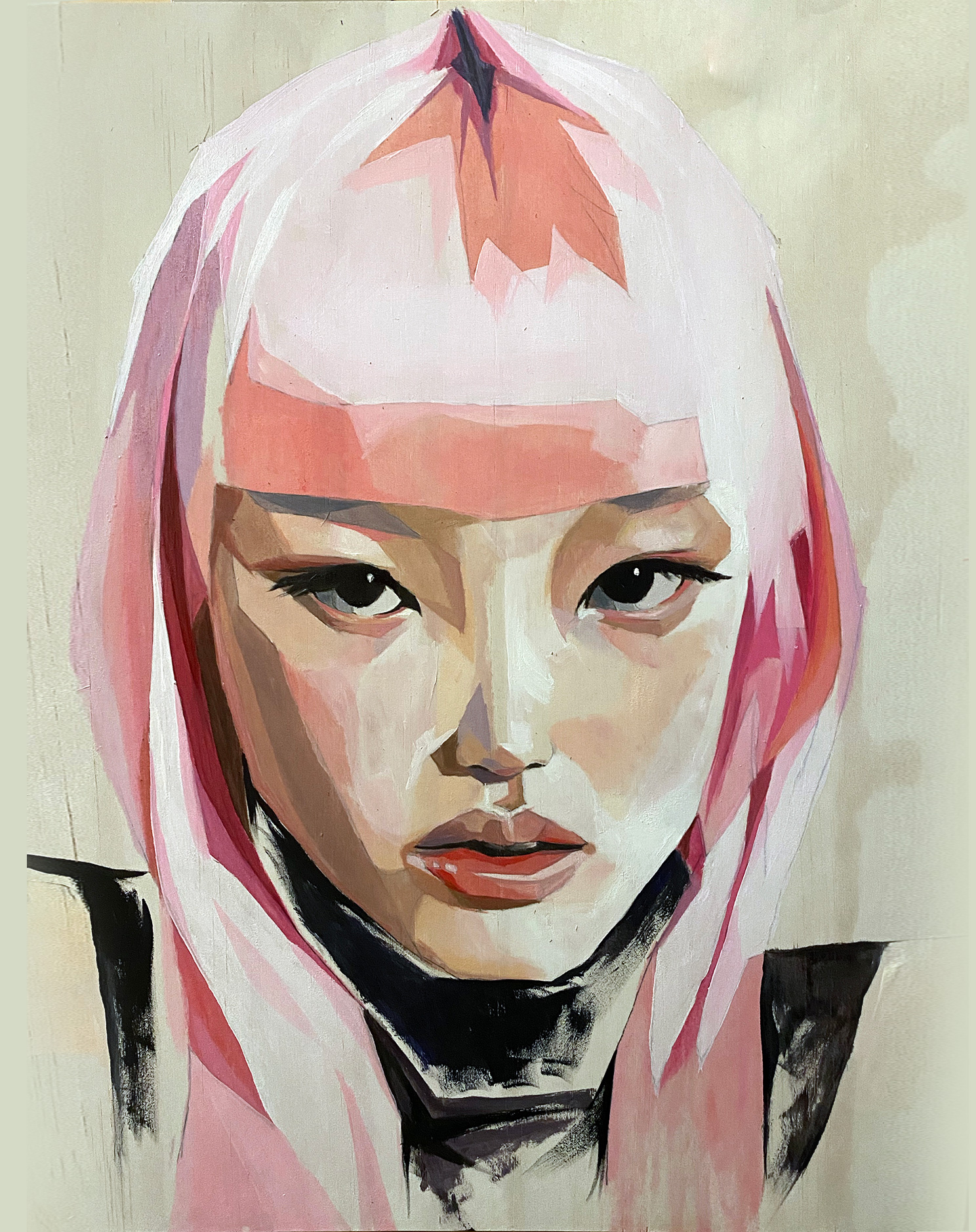 “Pink” by Chris Le is a captivating oil painting featuring a young woman with expressive eyes, framed by vibrant shades of pink. The geometric lines and dynamic hues create a striking contrast against the natural background. The white painted wood frame enhances its modern appeal. Chris Le’s design and illustration expertise shine through in this emotive and precise composition, making “Pink” a powerful and memorable addition to any art collection.
