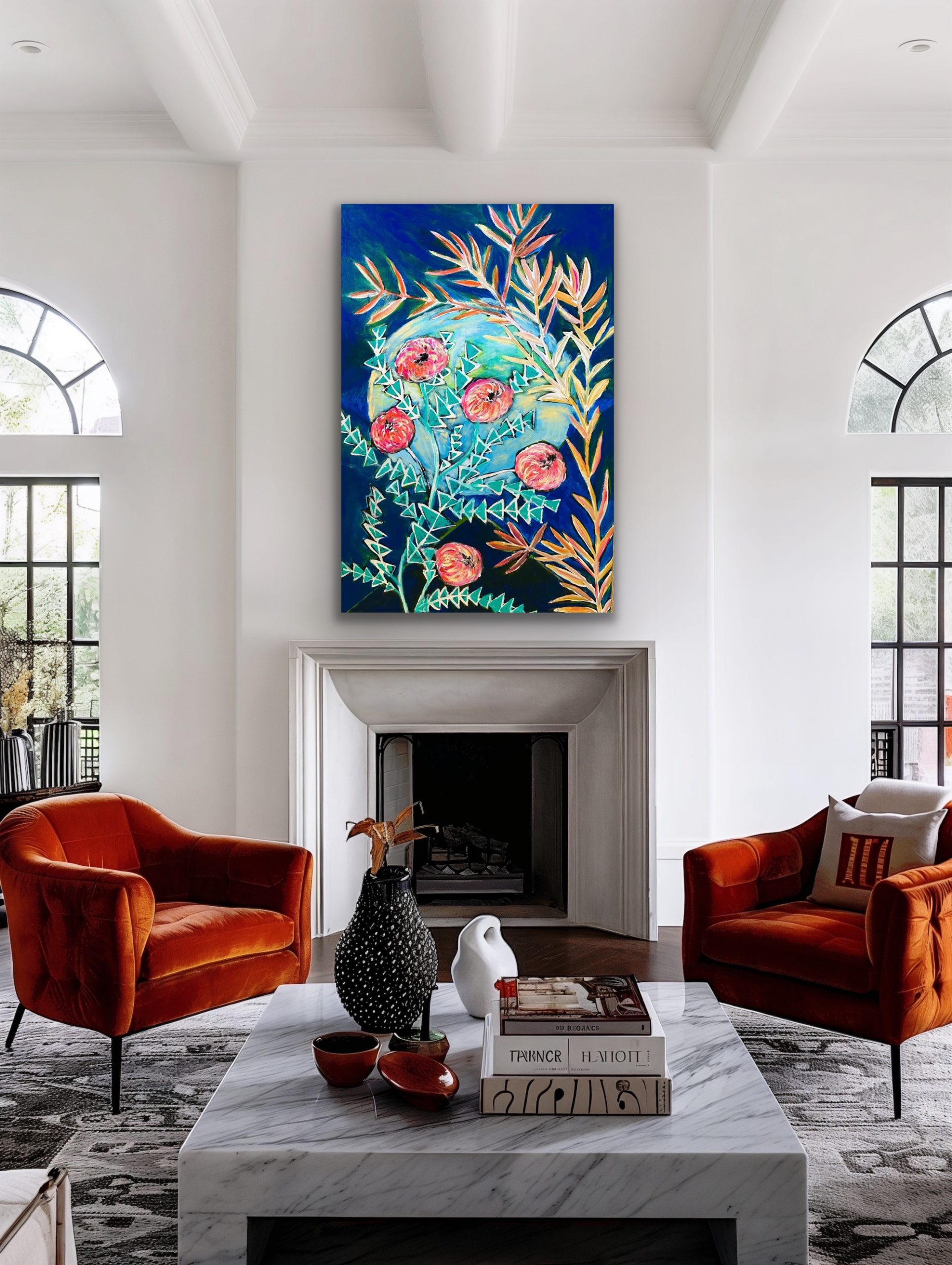 A beautifully, stylised, modern floral artwork with French Blue background and those colours loved by interior stylists world wide…..colours of 2025!