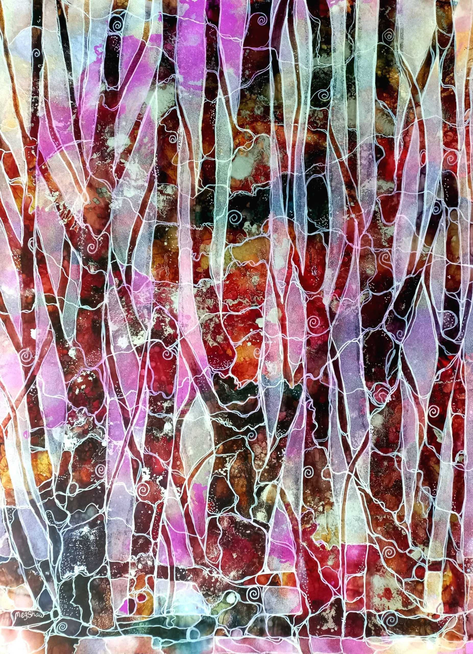 ’Pink and Copper Trees’ in the Eucalyptus Tree Series by Meg Shaw – This is a mixed media, negative space painting on yupo paper. I’ve used mostly pinks for the ink base, with highlights of copper, then worked white paint around tree shapes. I’ve also added decorative pen work, including spirals which are often featured in my artwork. A normal painting is done in positive space, but negative space paintings give an interesting and different perspective.