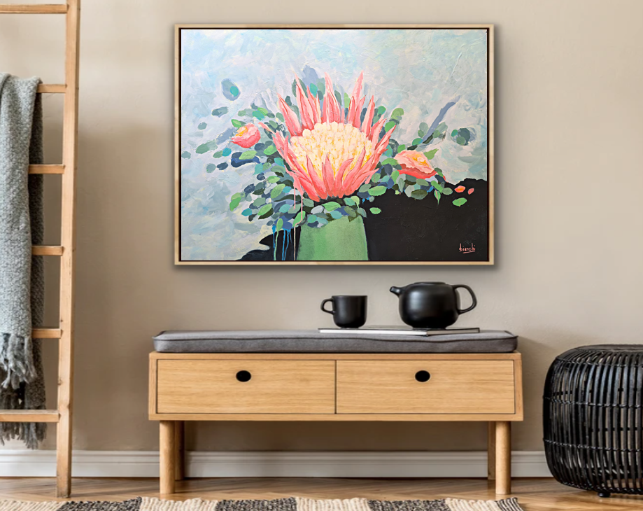 I constantly start my pieces with multiple layers of under-colour boldly placed onto the canvas. The aim is to create depth and mystery to the artwork. I then add brush loads of muted pastel colour to provide an interesting background in support of the protea, to ensure it is the star of the show.