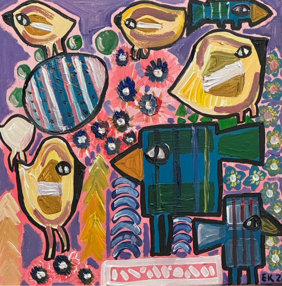 This artwork depicts an abstract bird landscape with a contrastive pink and purple background. What makes this painting unique is the use of black lines and bold unusual color. There are various birds spread-out through the painting with many different motifs.  Composition is key in this painting. The painting is simple but at the same time complex. Emma often uses these birds in many of her paintings – they are a joyful interpretation of the landscape and nature.
