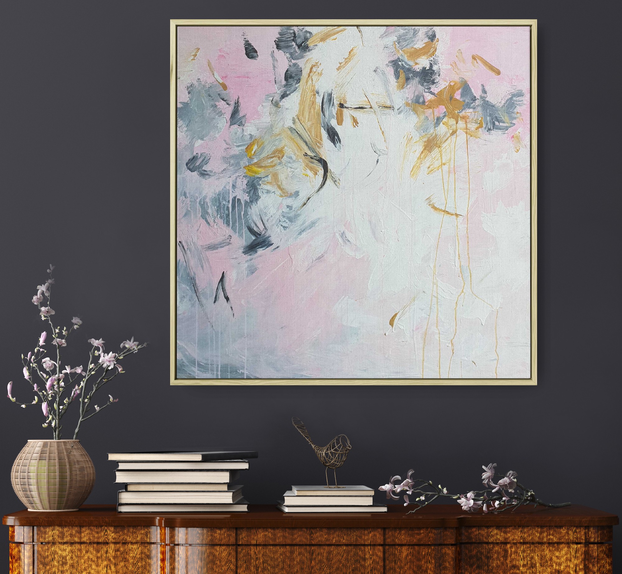 The painting does’t come with the external frame. The images attached are representations of what it could look like after being framed. No hanging wire.