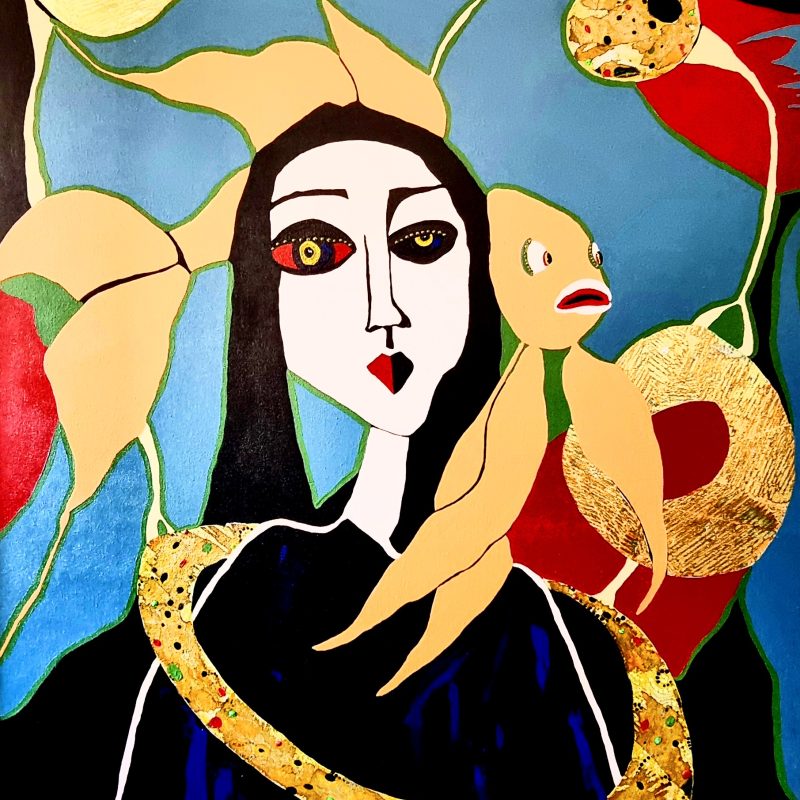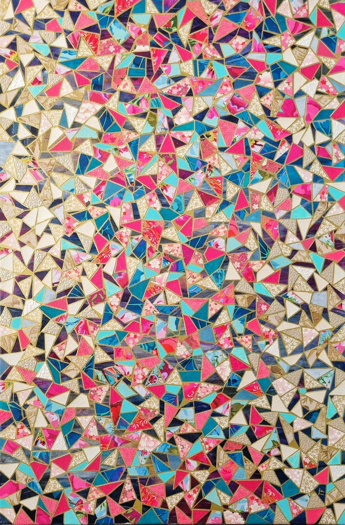 This painting was created in many layers. The first layer was made in acrylic paint and pearlescent medium creating the appearance of stained glass. The pearlescent medium is amazing in generating lots of light and sheen within the painting. Then I proceeded to make my “tiles”. For some I used acrylic pours, some were cut from the most luxurious handmade Japanese Chiyogami paper. It is such a pleasure to touch it and incorporate it in my work. Some other beautiful handmade and textured paper was used.