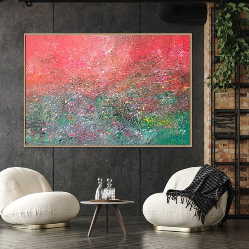 `Plumeria Blooms\` is a captivating oil painting that celebrates the beauty and elegance of pink and yellow plumeria flowers. The artist skillfully captures the delicate petals of the blossoms with varying shades of pink and vibrant yellow-gold centers. The brushstrokes are visible, adding a sense of movement and energy to the piece, while the warm color palette of pinks, yellows, and deep reds create a rich and inviting atmosphere. The composition of the painting is carefully arranged, with the plumeria flowers clustered together to create a striking focal point against a background of dark reds and greens. The contrast between the light-colored blossoms and the dark background enhances the visual impact of the flowers, drawing the viewer`s eye to the intricate details of the petals. The texture of the painting is palpable, with visible brushstrokes adding depth and dimension to the flowers and foliage. This tactile quality adds a sense of immediacy and life to the artwork, inviting the viewer to experience the beauty of the plumeria blooms up close. Overall, \`Plumeria Blooms\` is a stunning depiction of nature`s beauty, where the artist`s intention to capture the essence of the delicate flowers is evident in every brushstroke and color choice. The painting invites the viewer to appreciate the elegance and grace of the pink and yellow plumeria flowers, creating a sense of tranquility and serenity in the presence of nature`s wonders.