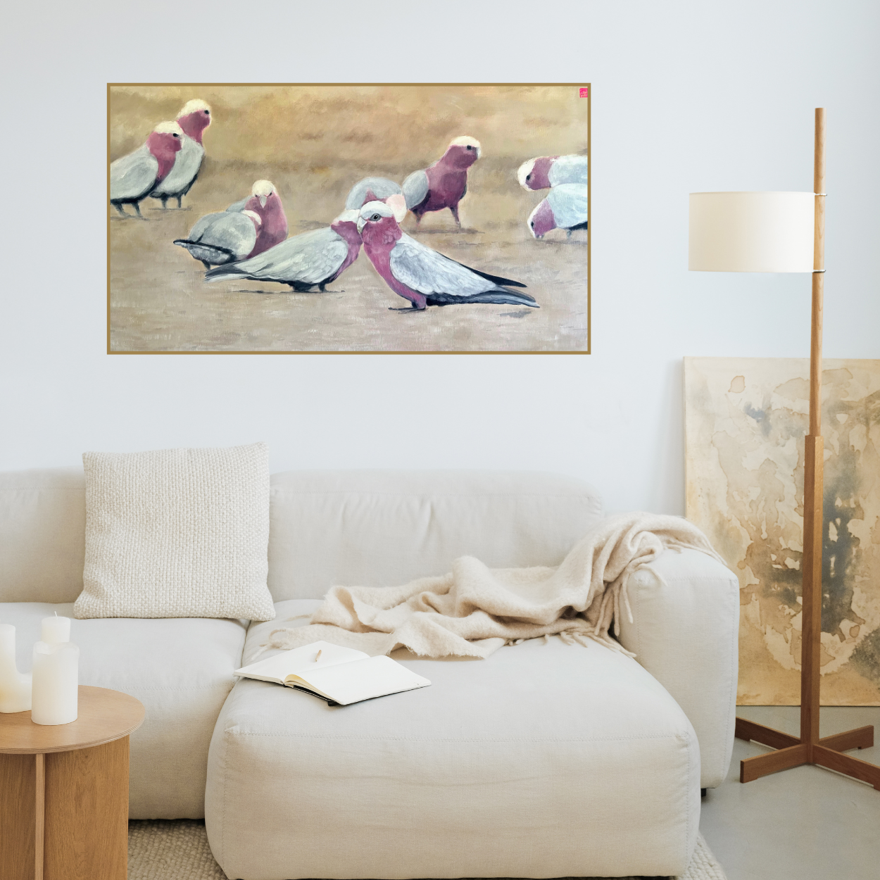 This piece features nine pink galahs, gathered peacefully as they feast on golden hay. The number nine in numerology and Feng Shui represents innovation, growth, transformation, and joyful change — all qualities this work is intended to invoke.