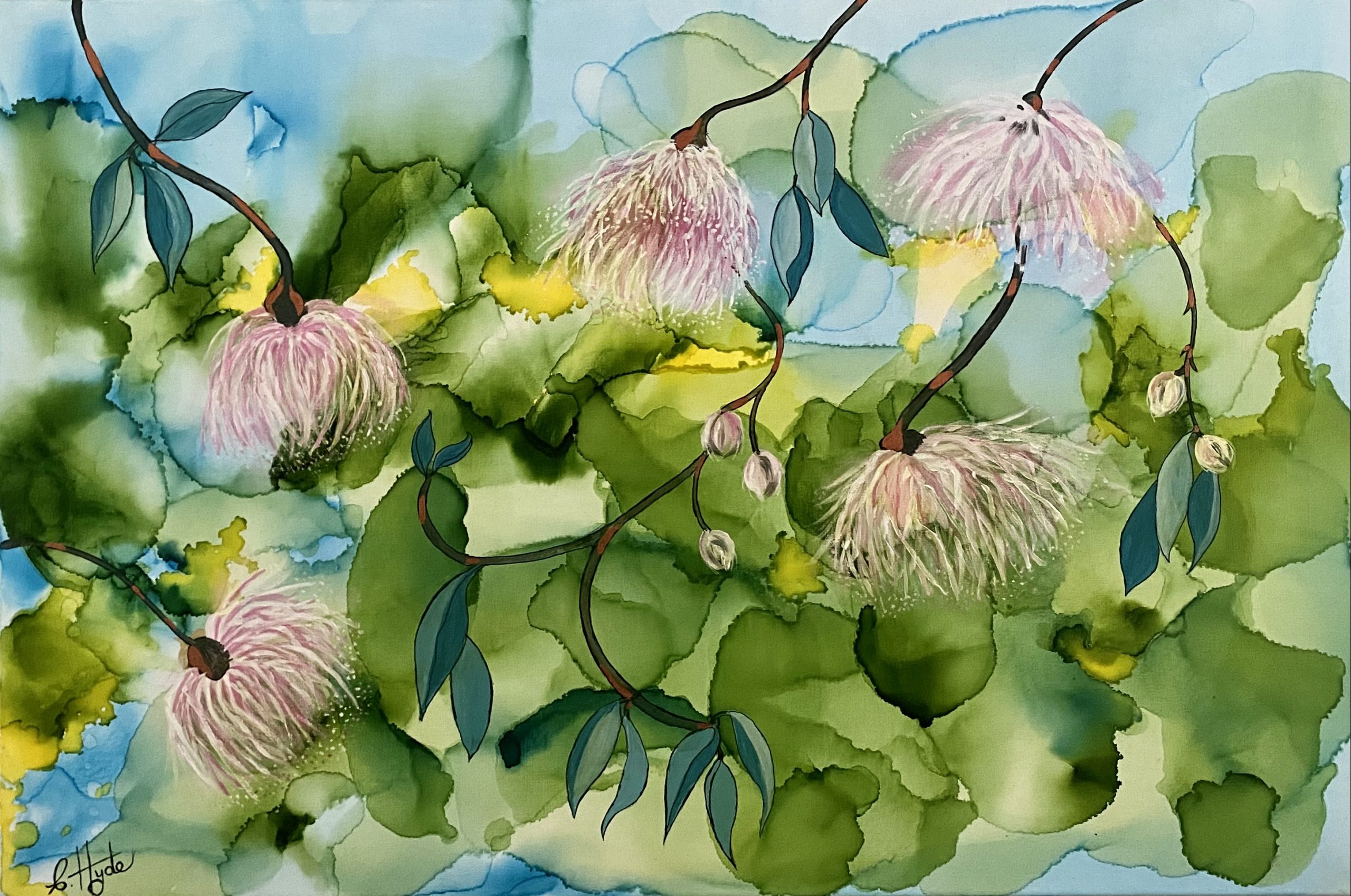 PINK GUM FLOWERS OF NATURE by Christine Hyde –Â A beautiful artwork of mixed media (inks and acrylic paints) on stretched canvas, ready to hang on your wall.