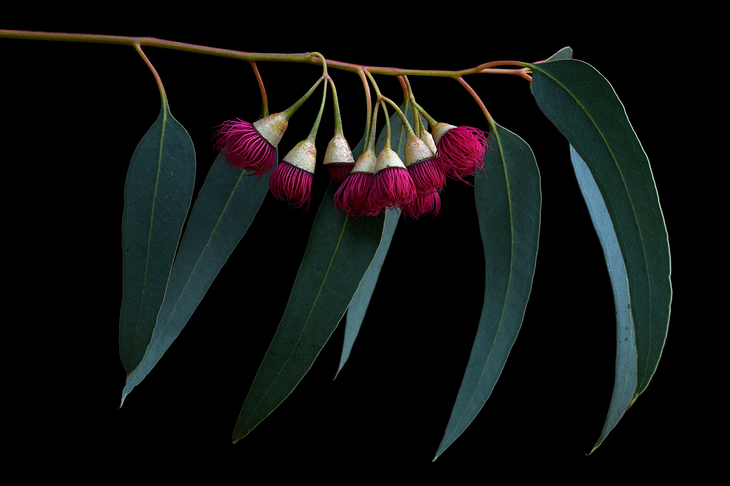 Australian native Eucalyptus blossoms in striking hot pink against cool emerald green gum leaves. ​Capturing the tones and details of our local flora in close up macro, photographed in only natural light with minimal post processing and no filters.