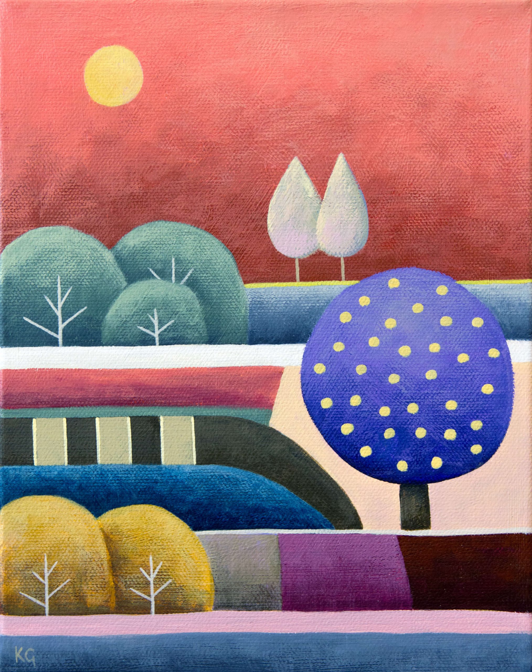 Pink Patchwork – Petite by Kate Graham. This small daytime landscape features a soaring pink sky with sun, interwoven with a patchwork of green, purple and yellow fields and trees below. It is an almost surreal rural scene that celebrates colour and composition. Painted in a naive style to bring a sense of charm and delight, painted with dry-brush effect to give it a textured feel. This piece is part of the ‘Patchwork’ series where colours are woven together in a patchwork of harmony and sometimes disharmony. The flattened perspective gives the composition a naive and whimsical feel. The painting invites the viewer to see landscapes from another imaginative point of view. This piece would fit anywhere in a home or office, bedroom or living room, and is a great way to either start your art collection, or add a little touch of colour to your decor in limited spaces.