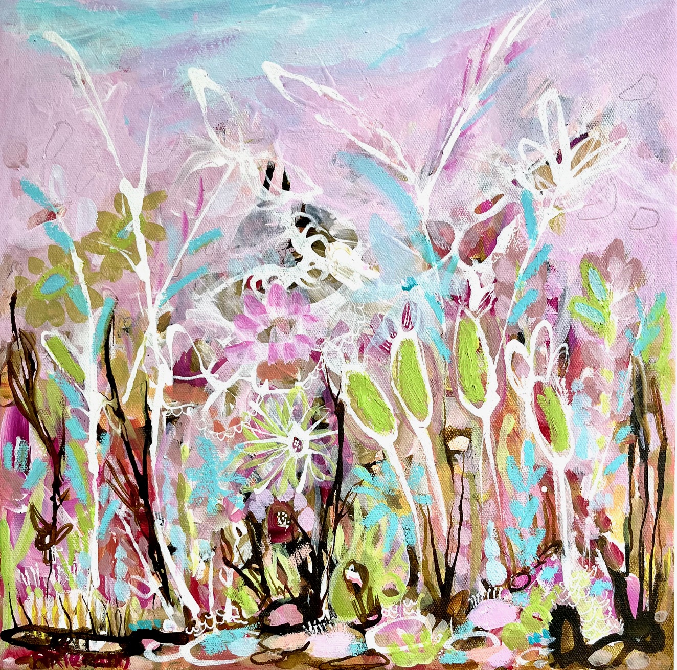 This soft colour palette of pinks & green draws you in to its magical, whimsy landscape. Layers of paint, creating swirls of movement in this sweet painting of joy & happiness.