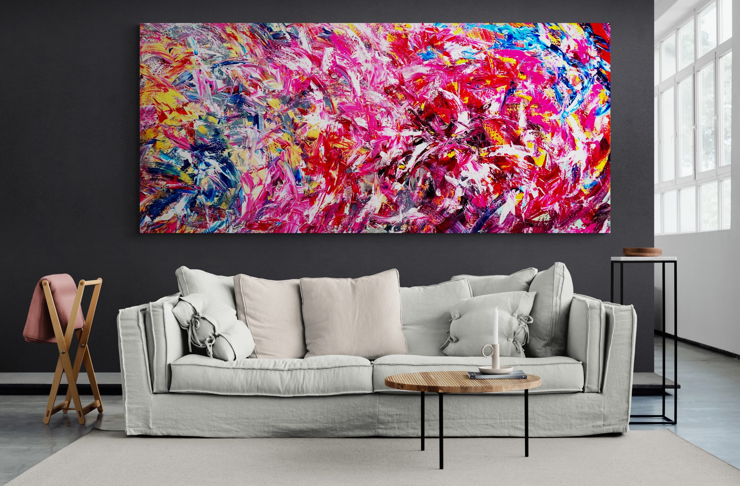 This artwork is painted on professional-grade canvas stretched and sealed with varnish. The canvas has dimensions 229 cm in width by 101 cm in height. The painting wraps around the sides of the stretcher, so the sides are painted in the same style as the surface. As such it does not need a frame.