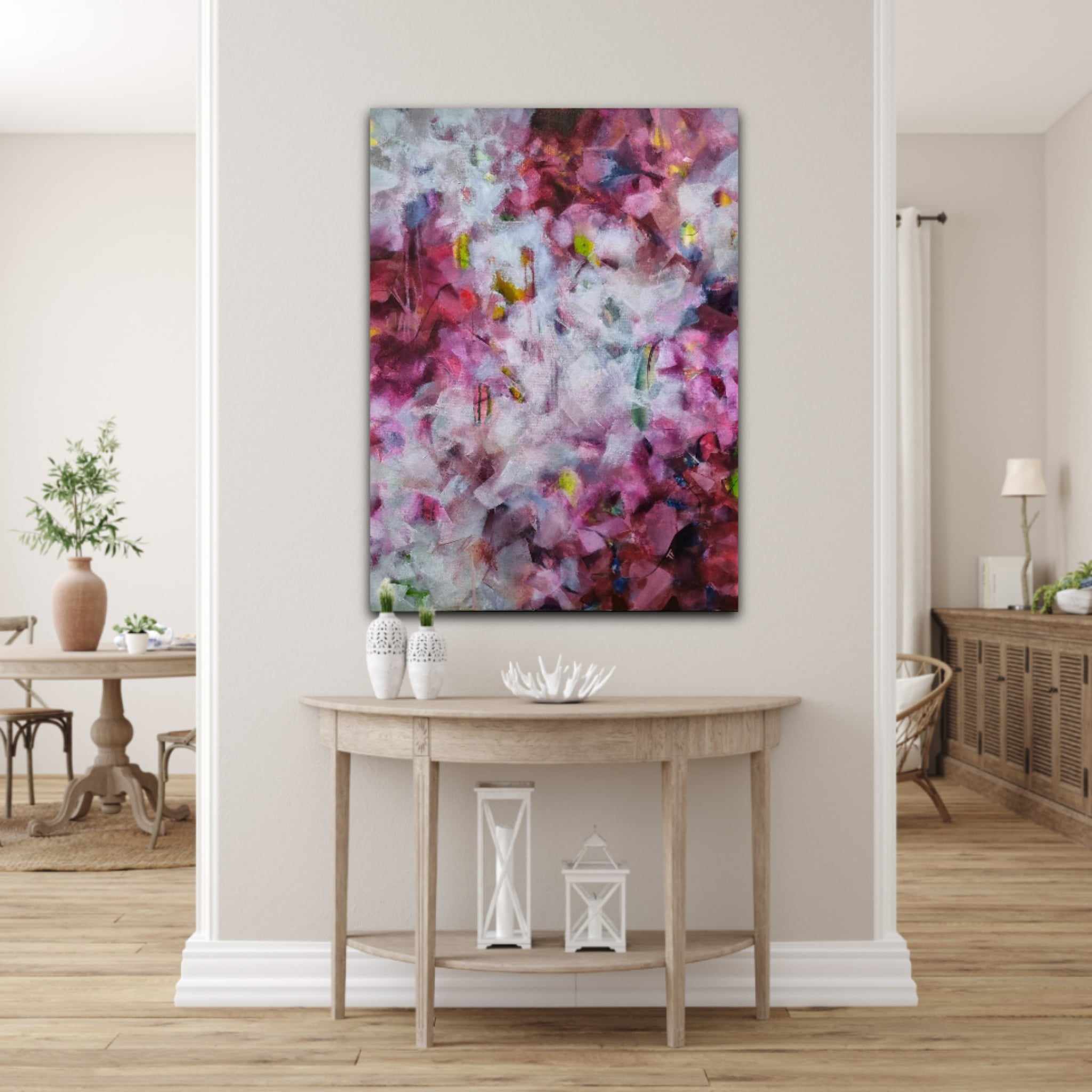 This painting is created in many layers with high quality lightfast acrylic paint. These layers create the depth and lightness. It has an airy organic feel and a beautiful flow. It can be displayed both horizontally and vertically.The edges are painted white. It’s signed on the front and on the back, varnished and ready to be displayed for years to come.