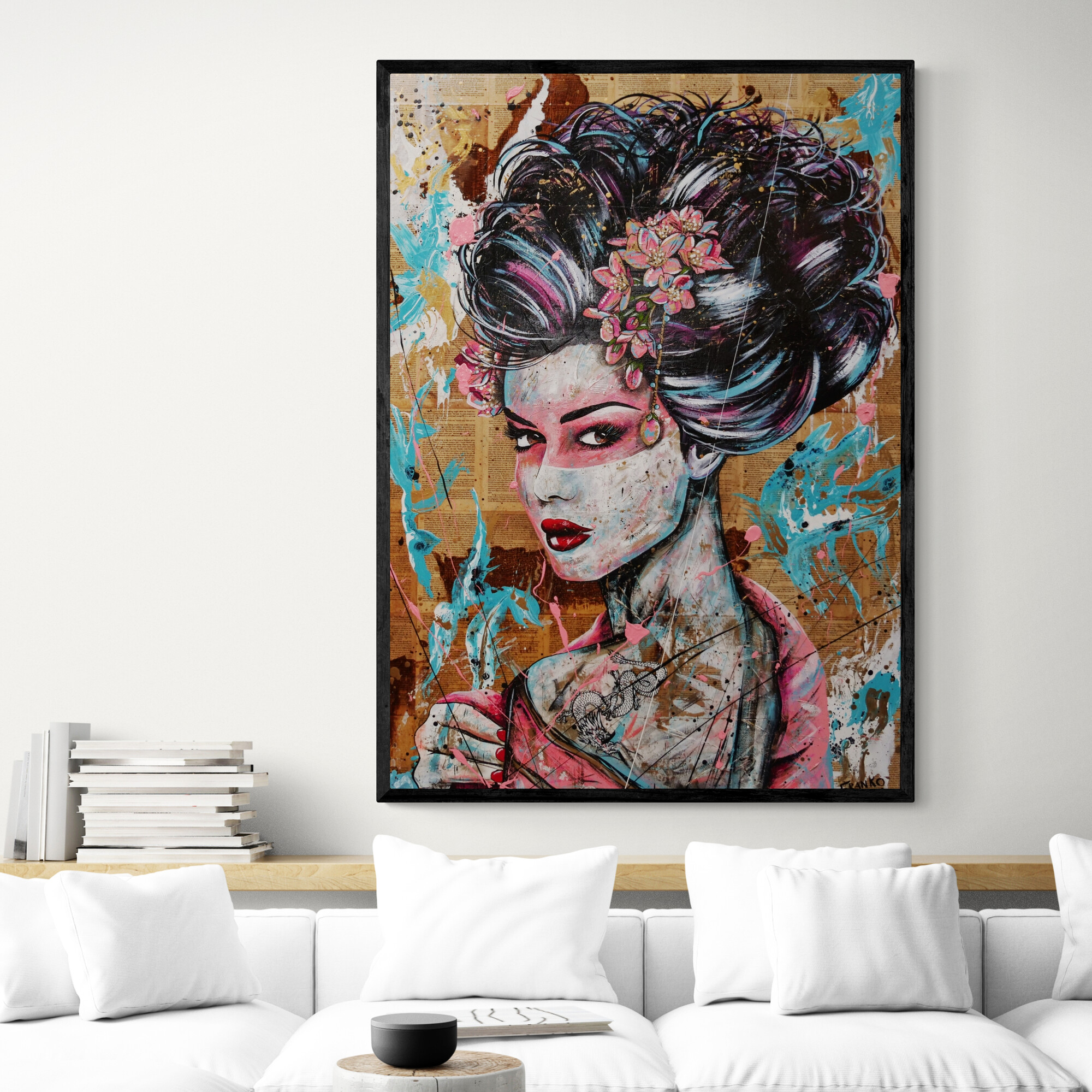 Aloha, spunky art lover! Thanks for looking in on this lovingly created painting, “Pinku.” She is a new beautiful piece in this ongoing series and features red, pink, turquoise, metallic gold, blue, white and black acrylics, inks and oil based distillers that are often diluted with turps. Painted on pages of the book ‘Memoirs of a Geisha’ by Arthur Golden… textured and layered and stuck to the canvas and sealed with a binding varnish to ensure they will stay where they are meant to… On the canvas.