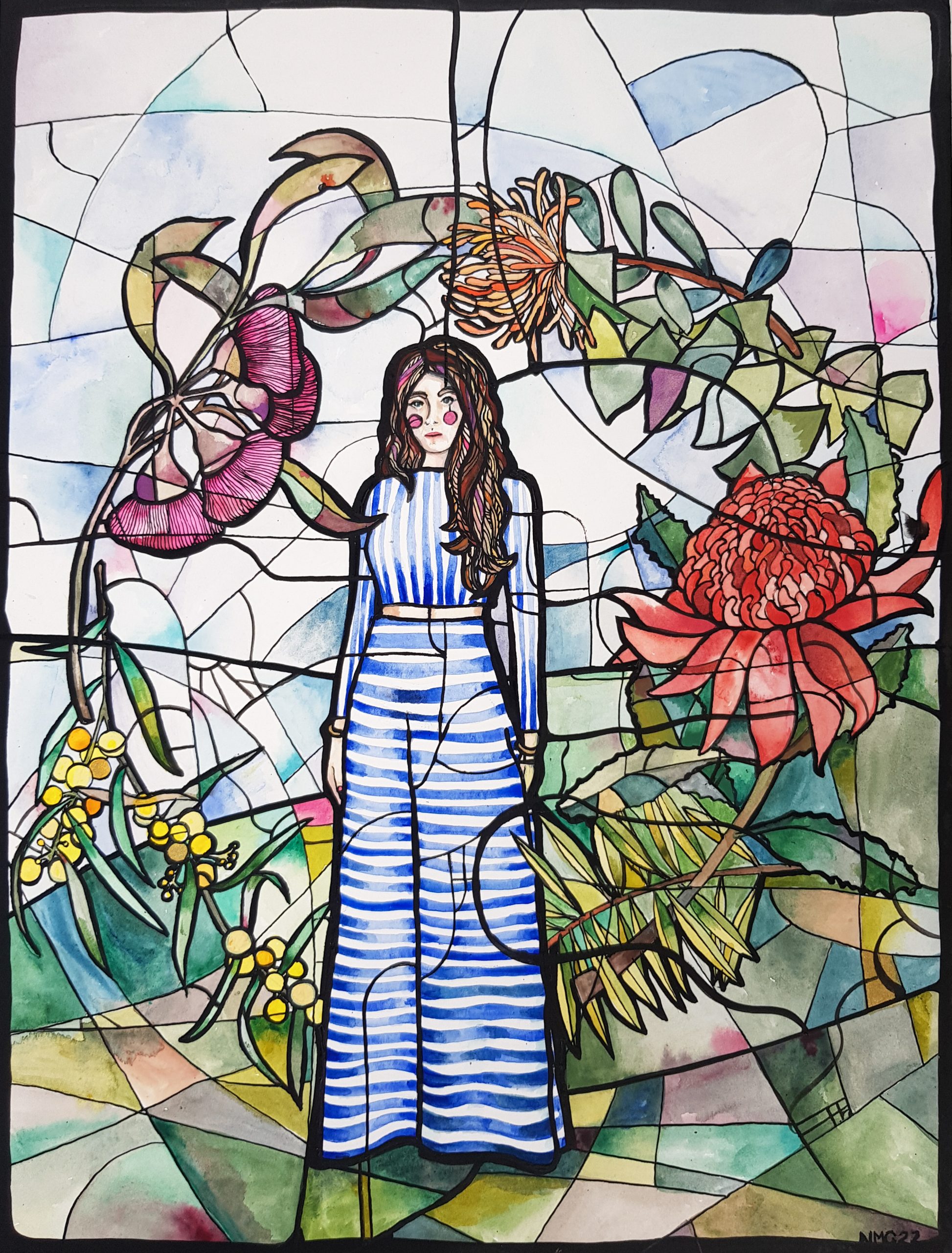 Surrounded by oversized Australian flowers the central figure looks out from a stylized landscape dressed in blue and white patterned clothing. Waratah, pin-cushion, wattle and gum flowers with banksia leaves make up the floral wreath