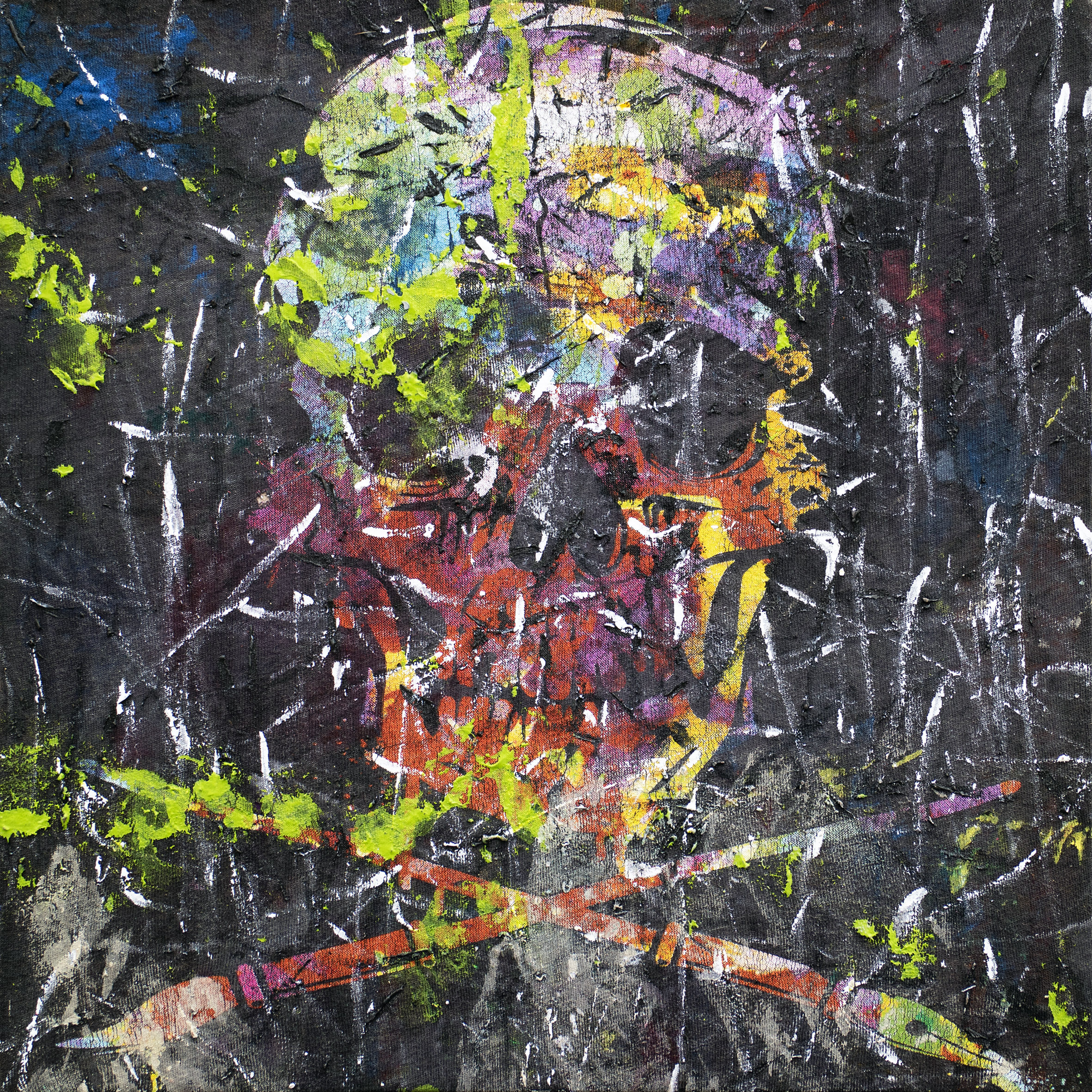 Mixed media on t-shirt worn while painting, sealed over birch board