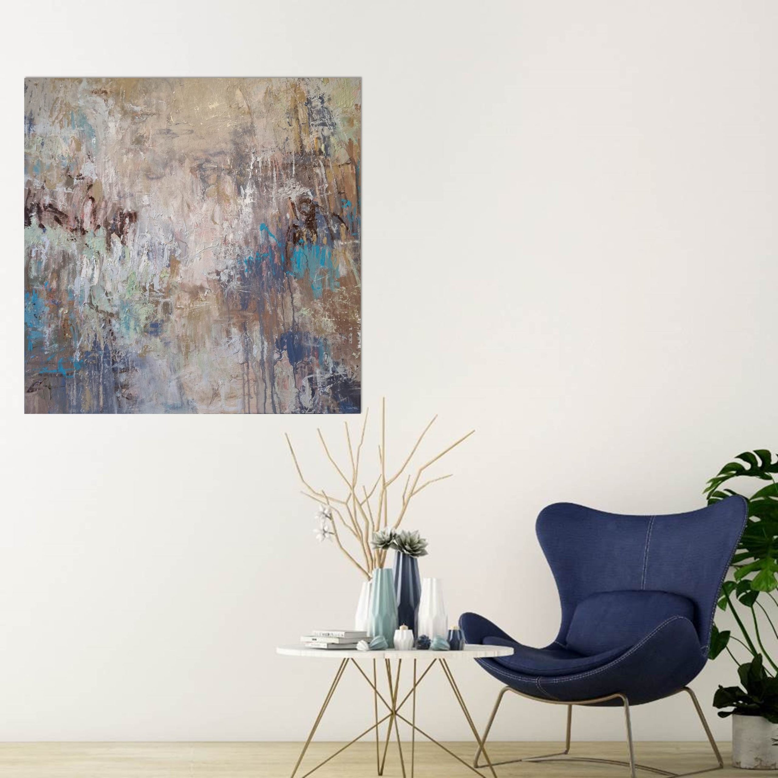 This painting is finished with a modern soft satin protective finish and matte white edges. It’s feel within a room is dynamic and decorative, yet holds a grounding and calming effect, sure to make an appealing feature, at home equally in a domestic interior or corporate space.