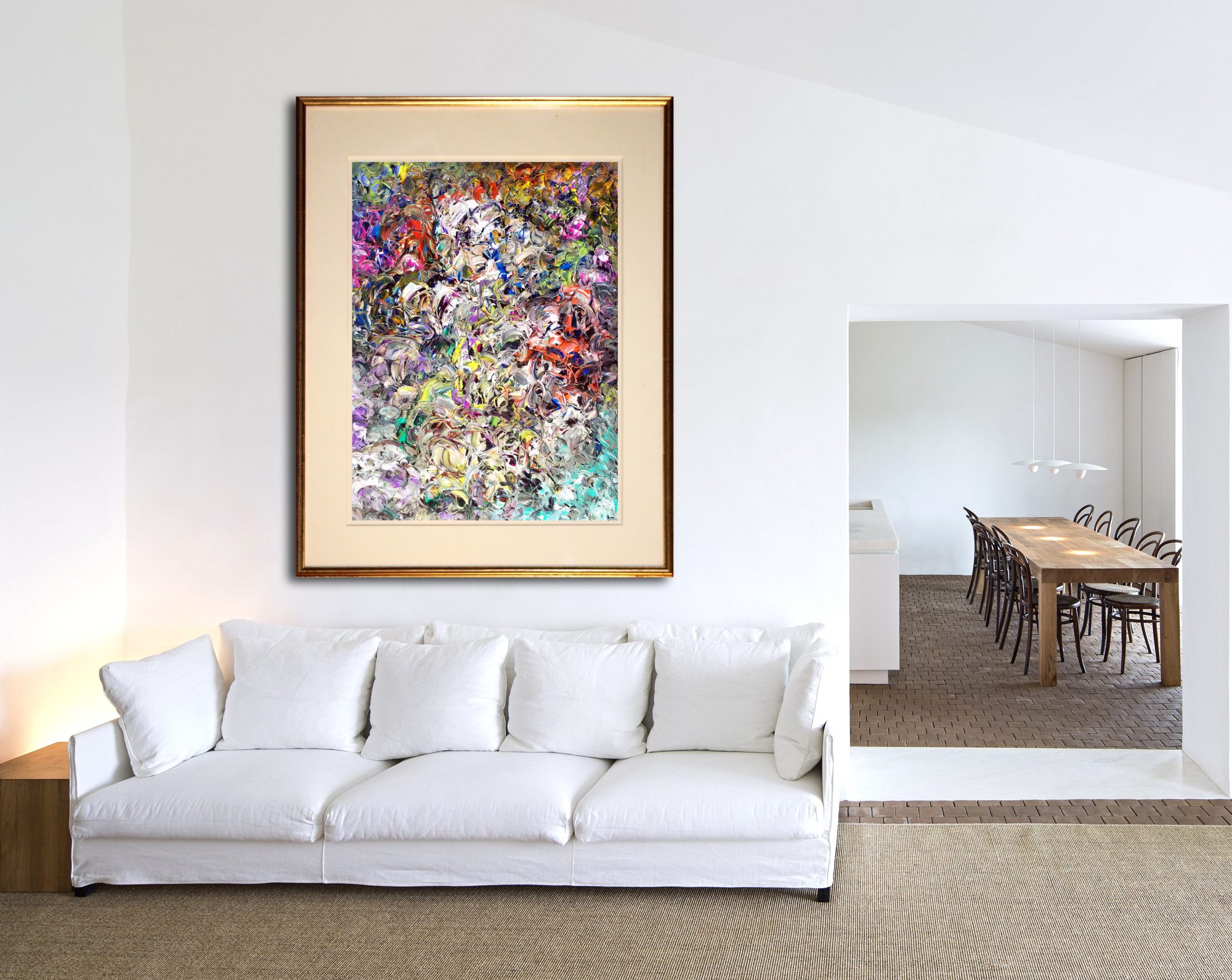 In the photos, where the painting is shown mounted on a wall, these are purely for illustrative purposes. You should review the dimension of the artwork to be sure the work suits your needs. In the case when a painting is sold without a frame, of course, you can add a frame of your choosing and so it will add to the overall dimensions.