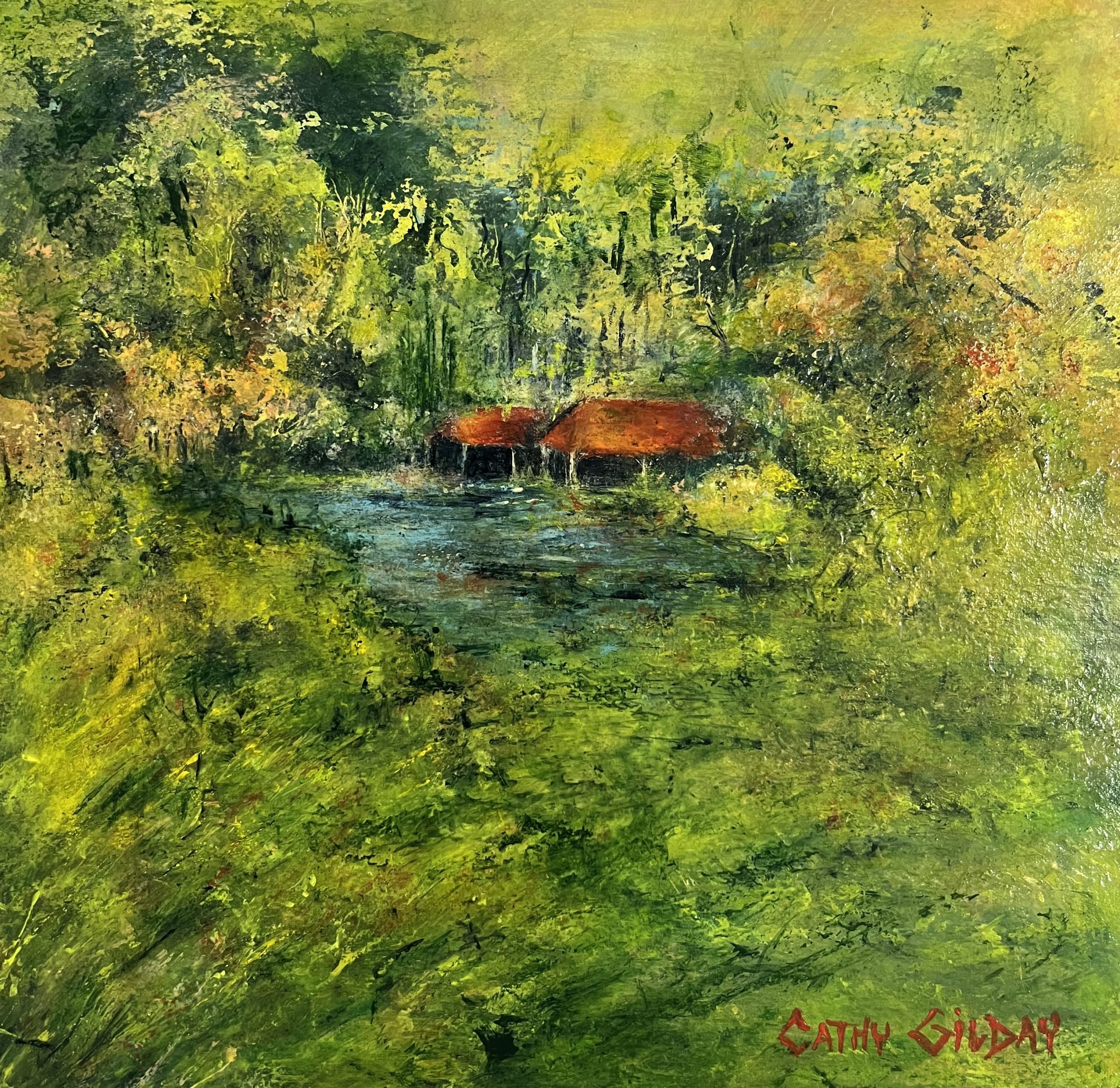 I’m not sure if this lush green landscape was inspired by a distant memory of somewhere I have actually been, or just purely from imagination. This little painting has heaps of lovely texture and the central focus is on the rustic old homestead and its red rooftop. It has been framed in an ornate gold frame and is ready to hang.