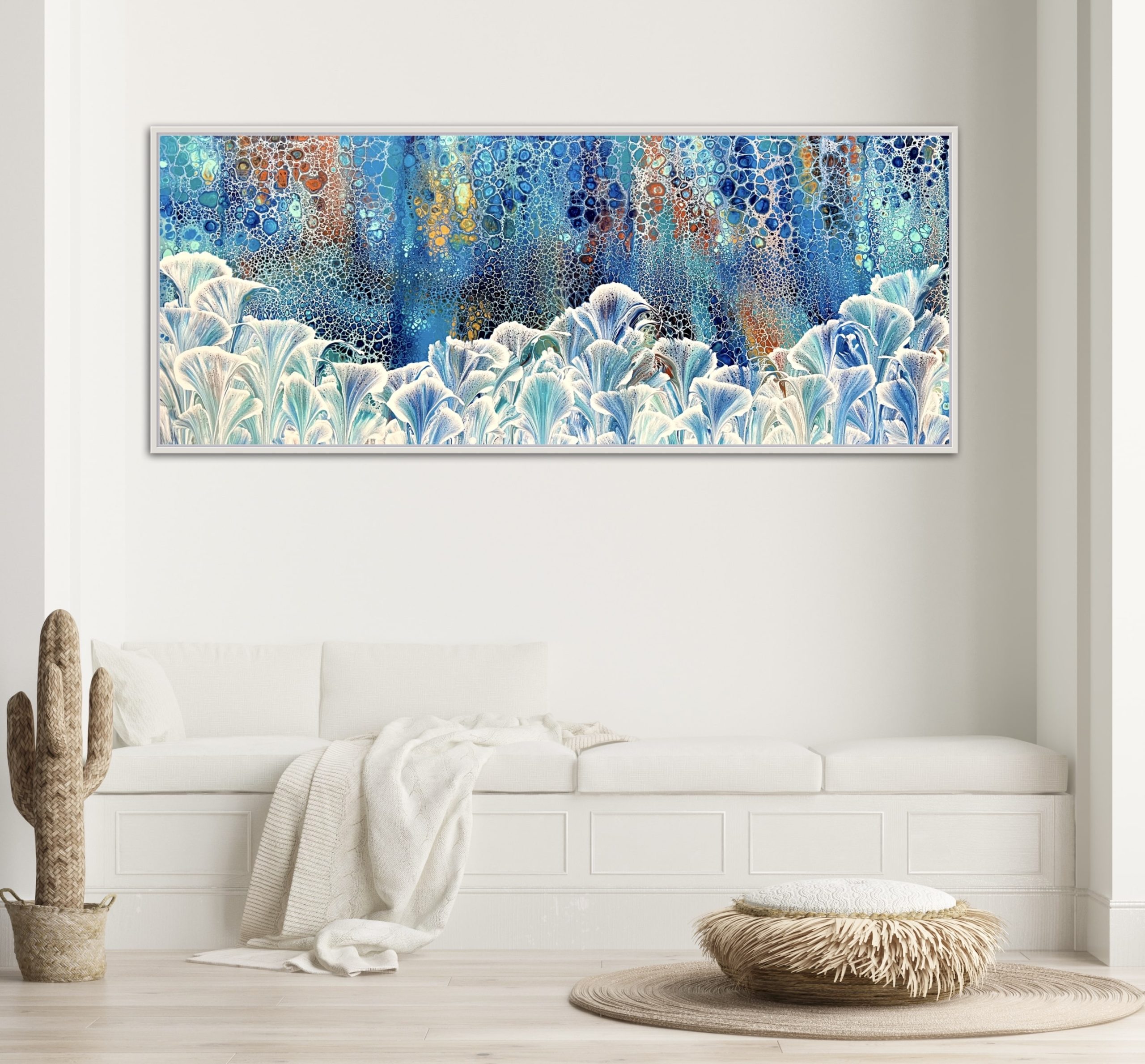 Playful Valley is inspired by nature and depicts in abstract Calla Lilies growing tall and in abundance with a lush valley full of colourful flora behind. Created using various techniques combined to allow increased flow, interaction and separation of colours to create interesting patterns where pops of colour can be seen emerging from underneath. This added dimension adds lace and cells to the artwork creating an interesting and one of a kind painting that can never be replicated.