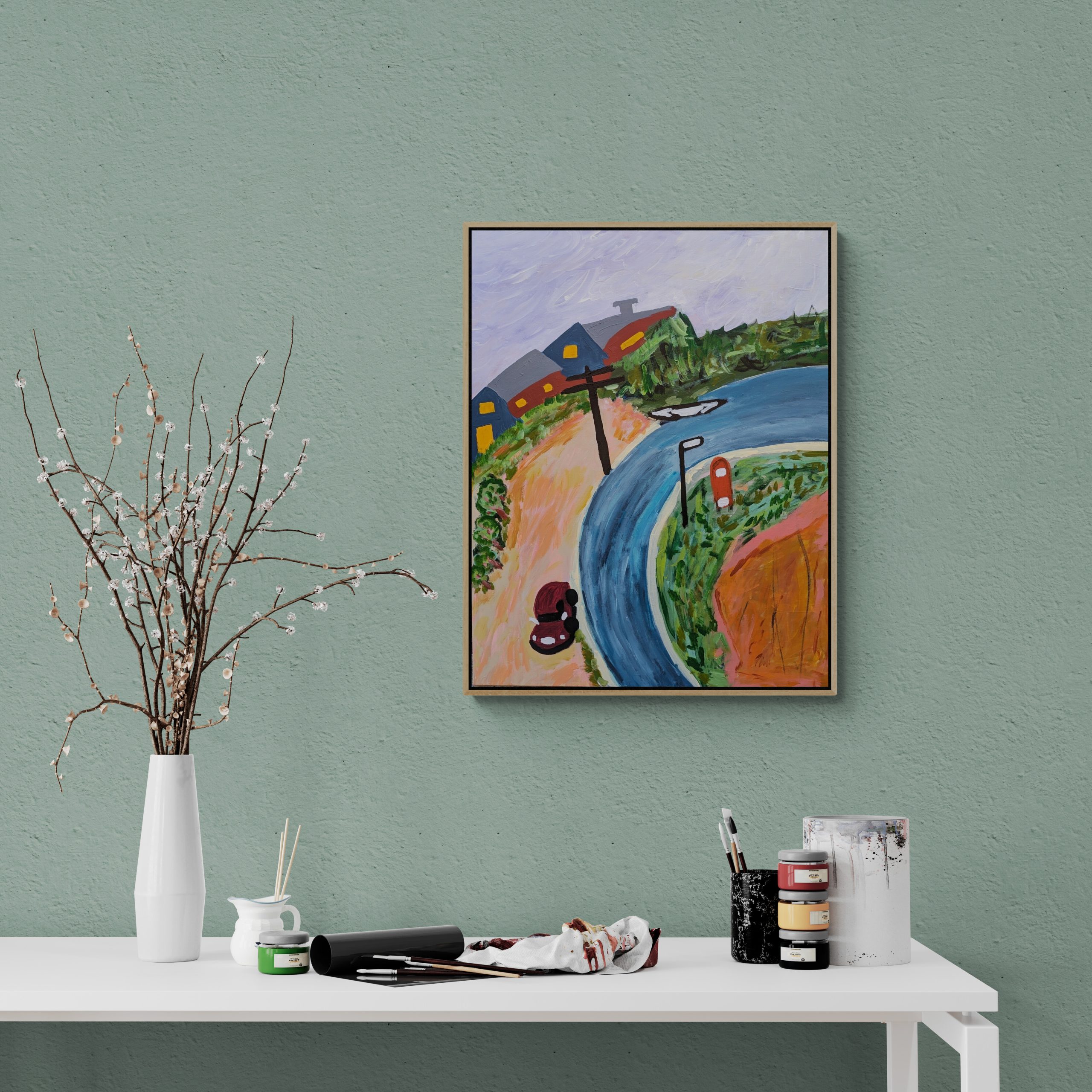 Immerse yourself in the vibrant and enchanting world of “Pleasure,” an acrylic masterpiece that captures the essence of a tranquil beach scene. From a high vantage point, the viewer is invited to explore a landscape where a winding road leads to a charming house nestled amidst lush greenery.