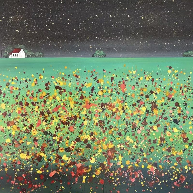 In the foreground, a close-up of red and white paint introduces texture and dimension. The artist’s meticulous attention to detail is evident, from the delicate strokes depicting blades of grass to the graceful curves of clouds dancing across the sky.