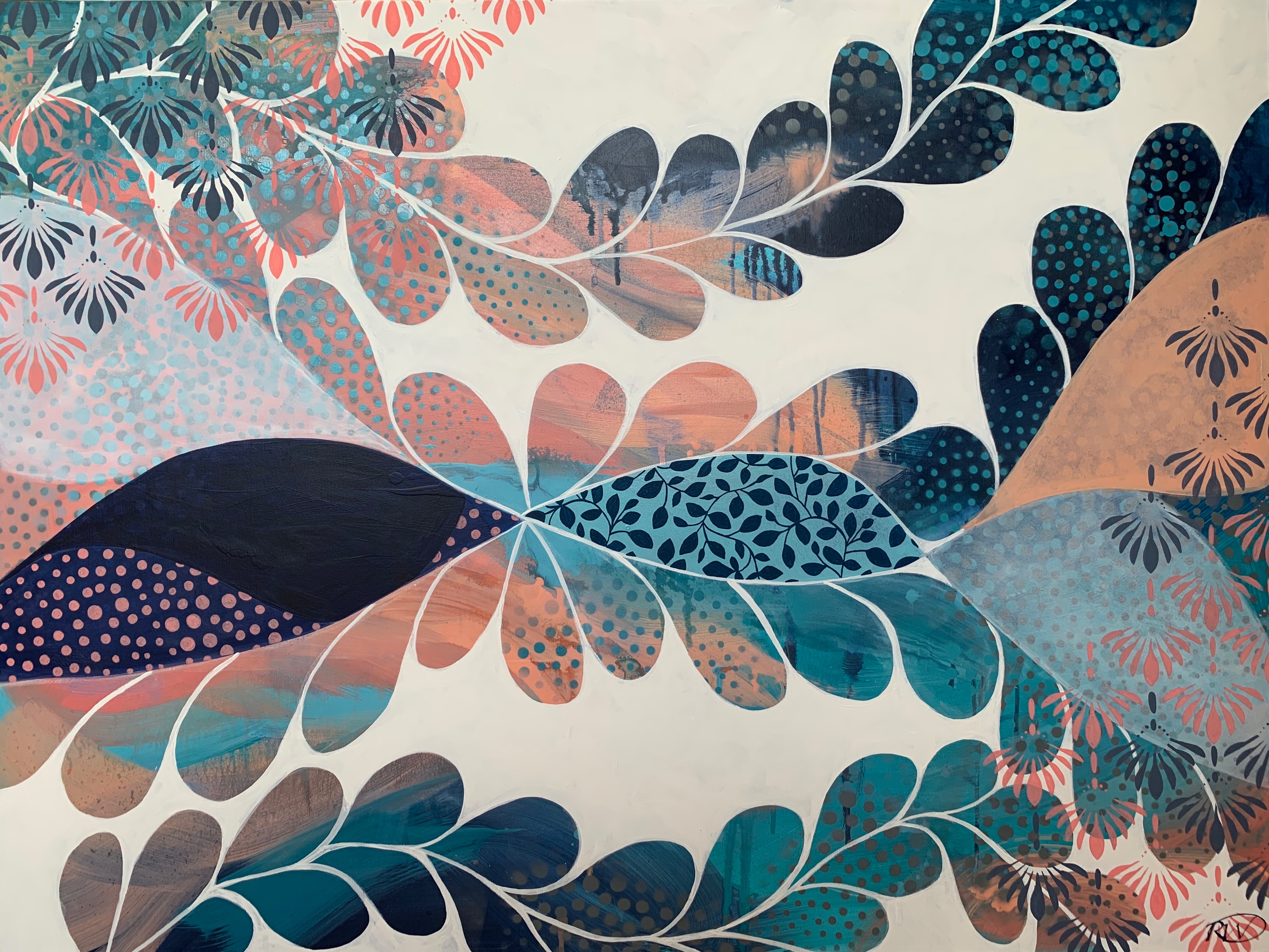 Plethora – This artwork has been produced to reflect my interest in stencil pattern and organic shape. Spray painted dot stencils and flow acrylics have been overlaid with more structured organic shape and pattern detail to increase the sense of aesthetic appeal in this painting. Pastel hues have been juxtaposed with navy and white to create a sense of contrast and direction in the work. This artwork would be the perfect addition to any blank wall space as a feature piece.