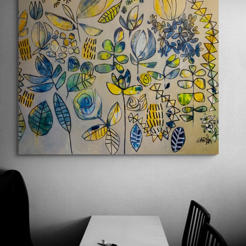 Pochampalli by Gayathri Shiva – This painting is a homage to the centuries-old ‘Pochampalli’ style of weaving that, in the 21st century is conserved by fewer than 10,000 weaving families in India. In the dimensions and intersections of colour, the artist celebrates the depth and richness of the fabric and the lives of its creators.