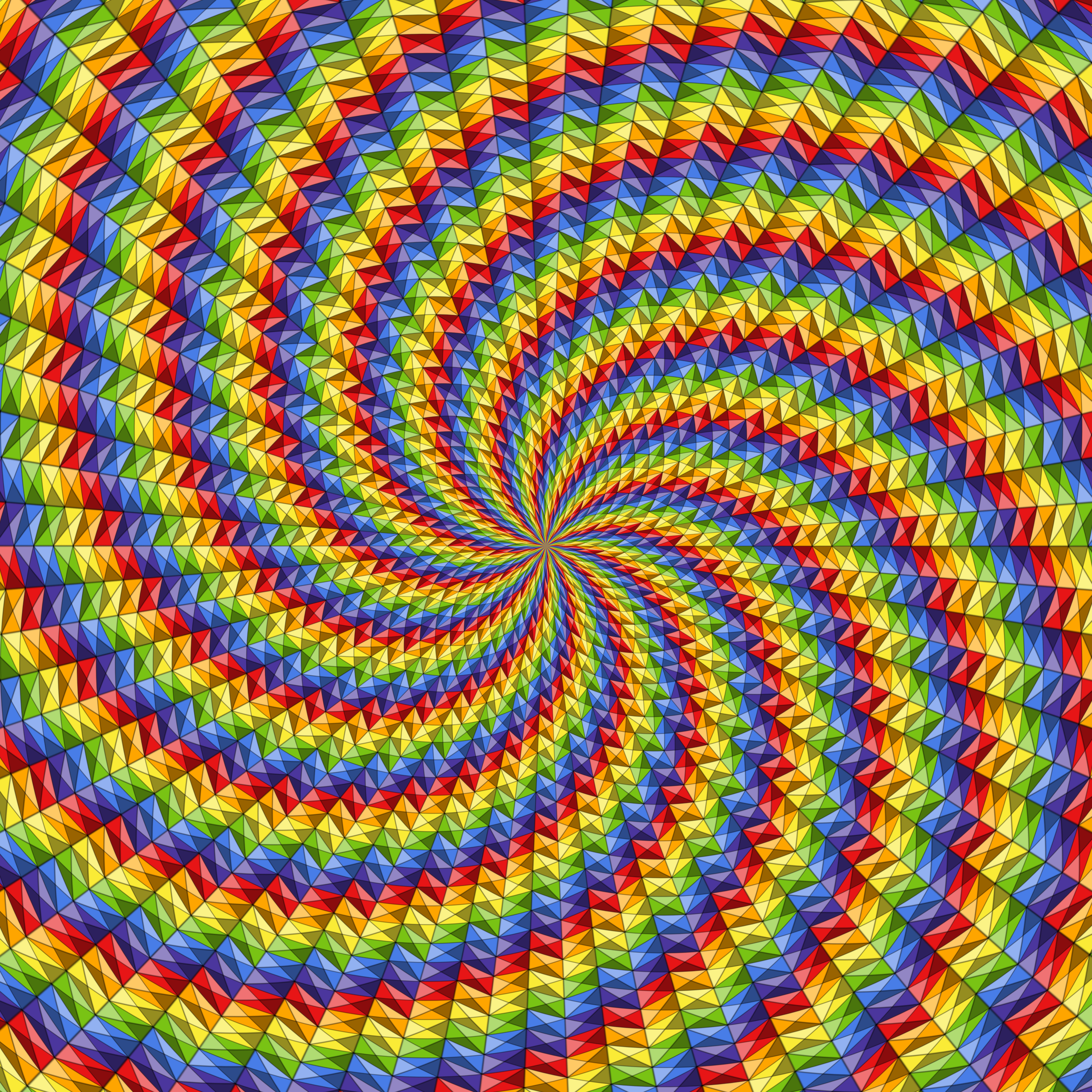 ‘Polar Tessellation No 8 – SpiralRhombus Rainbow’ by PLAYlogo, with rhombus tilings employing the artist’s signature colour faceting technique. This hypnotic image, generated using custom algorithms in Wolfram Mathematica, is the result of incremental improvement of techniques specifically tuned for optimal printing. The polar mapping method used is not just some cheap effect in a digital editing program; note how the central region does not suffer from the typical pixelation that cheap polar mapping effects exhibit. The black edge lines have a very slight blur to reduce pixelation. At super high 7680×7680 resolution, this image was created for quality printing at larger sizes and for display as quality mounted wall art.