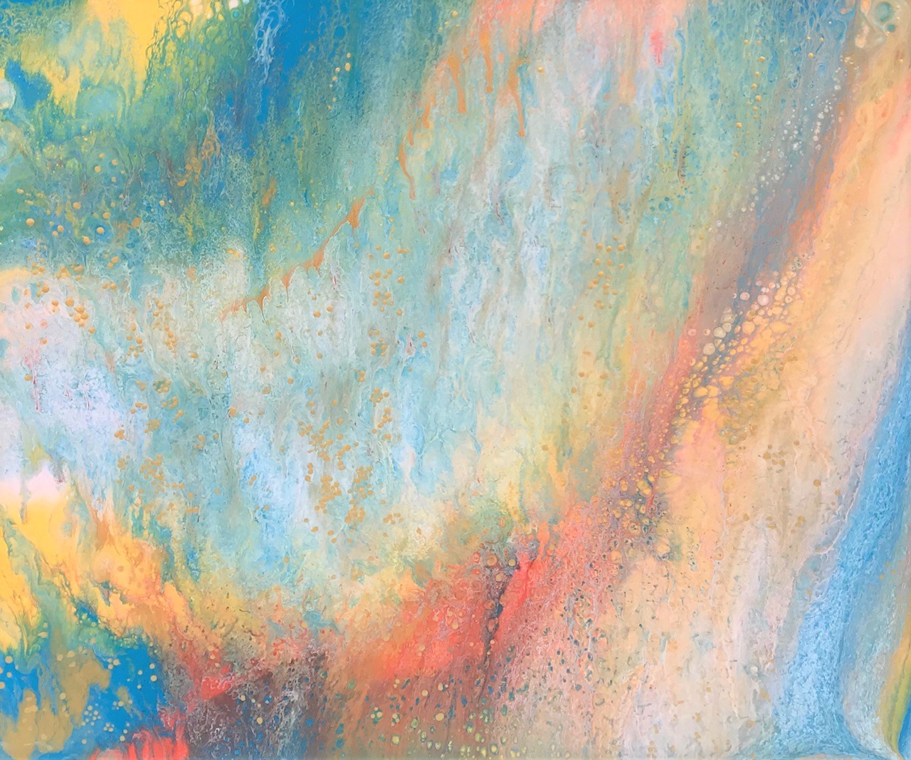 This is an original and unique abstract painting. The painting was inspired by the pollen bloom that occurs in Melbourne at the start of Spring. The colour scheme (metallic orange, cerulean blue, sunny yellow, gold and bright red) captures the wide array of seasonal colours.