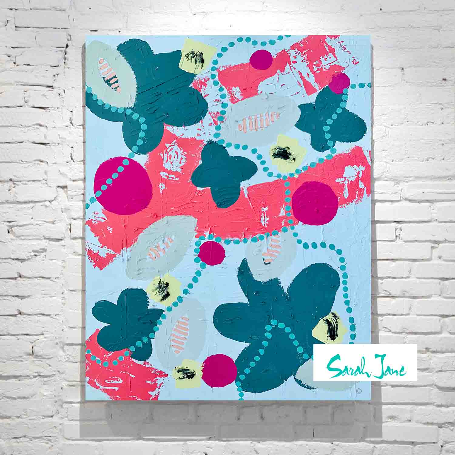 Following on from the first painting we have continued on with the theme of abstract flowers and plants in navy and grey with pink stripes representing leaves. The pollen itself is enlarged in large hot pink circles moving around as it is transferred your friendly bee which is depicted in lime yellow and black. We have used aqua dots and red-pink pathways to show their travel from flower to flower.
