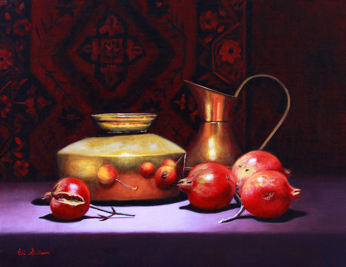 I adore painting fruit, and I love this brass pot with glowing metal design, it complimented the Pomegranates so well