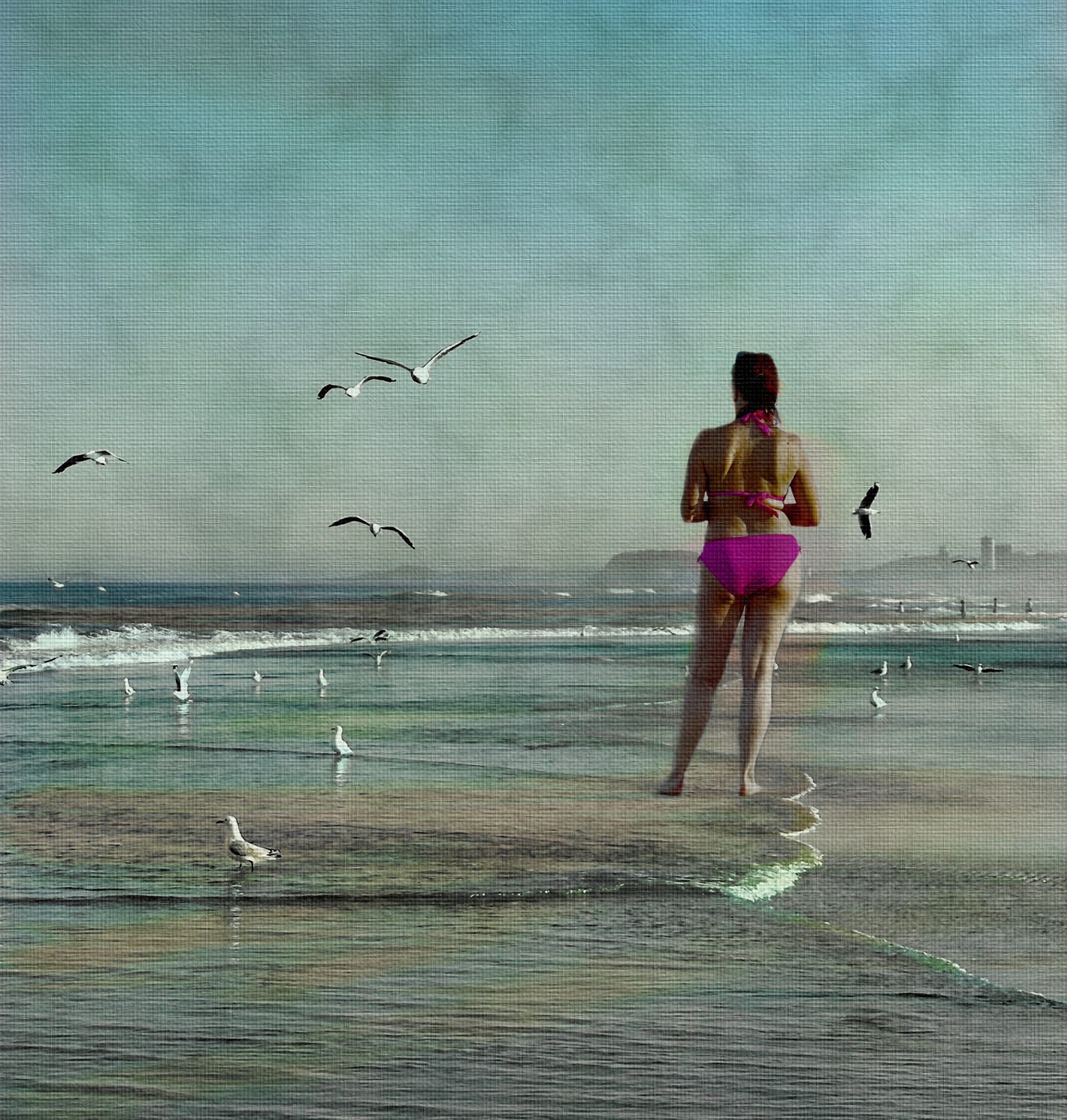 Pondering by Maria Flourou – Limited edition 100 photographic fine art print. Printed on fine art paper, this is an original digital art work of beach life in all its forms; sun, surf, people and animals. Shot and edited with iPhone14pro using layered applications.