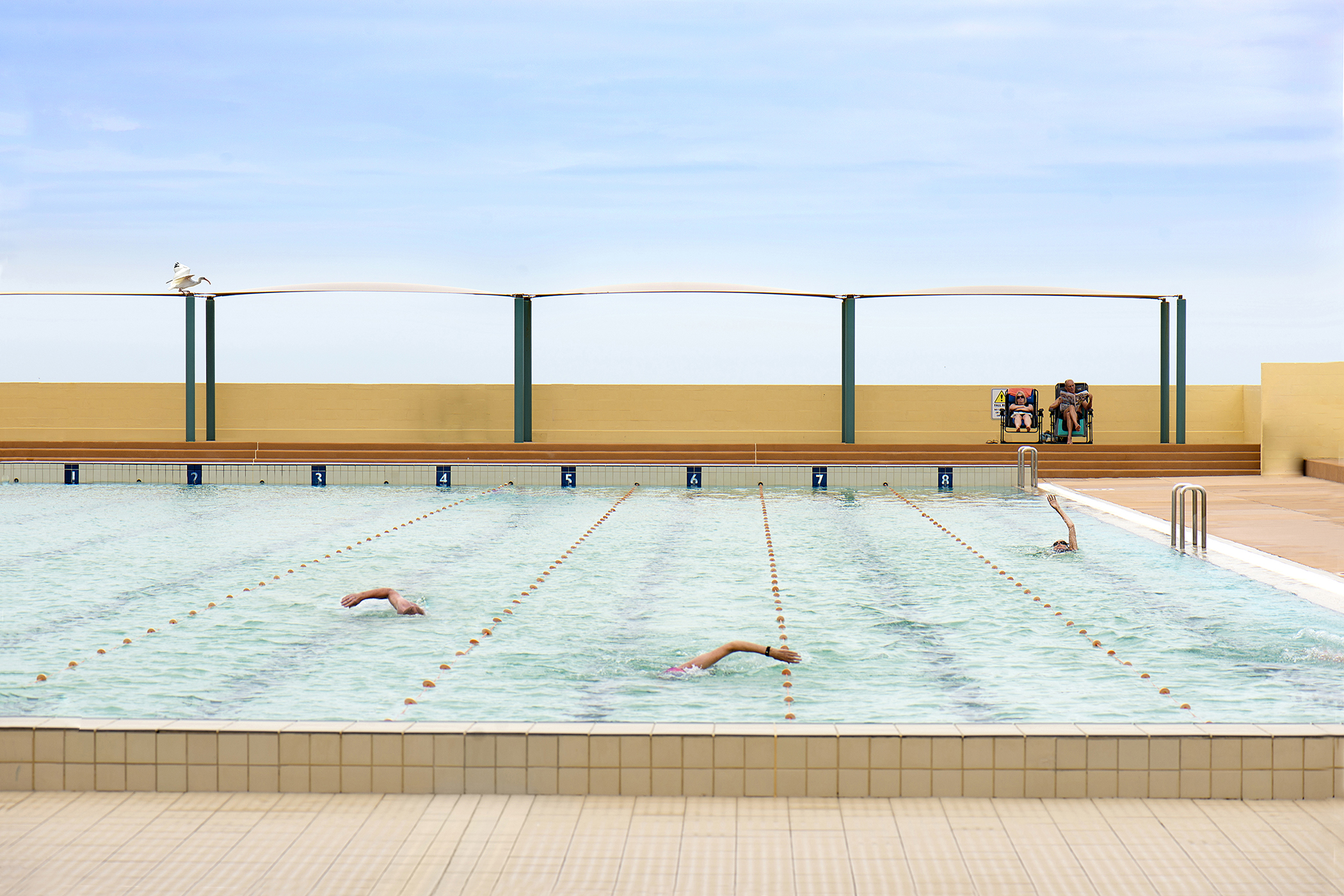 Port Kembla Baths – Art Deco by fine art photographer Peter Masters. Port Kembla baths is one of the most beautiful of Australia’s east coast ocean baths. Its striking  lines reflect perfectly its origins in the great Art Deco era of Australian architecture. The muted pastels add to the restful atmosphere of nonchalance and promote memories of long Australian summers. The quirky touch of the Ibis on the roof brings balance and adds to the overall story within the image.  This artwork is printed on archival canvas, guaranteed against fading for one hundred years. It is part of a limited edition of 50. Box Framed in Tasmanian Oak. Personally signed and editioned on the reverse.