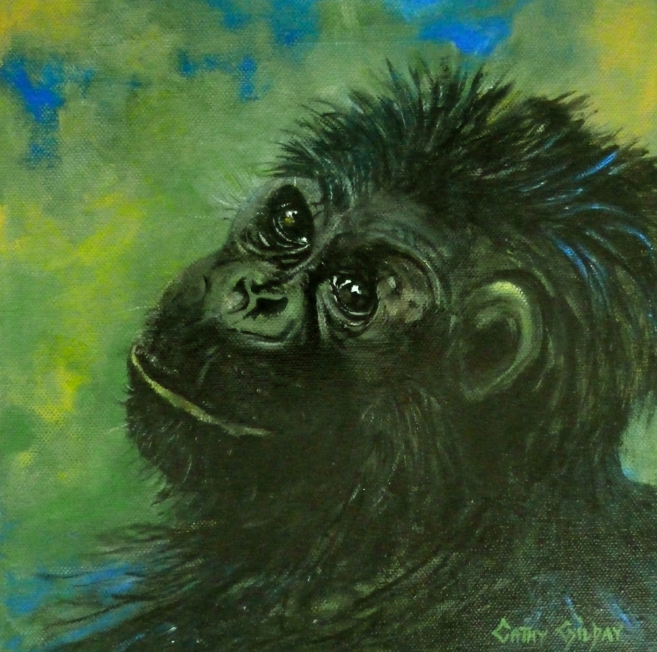 Portrait of Fifi by Cathy Gilday – I love to watch monkeys and apes! The expressions on their faces‚ the antics they get up to and the fact that they always look like they’re having fun. In this portrait, I have used a non traditional palette, to give the piece a less traditional‚ almost grungy look. Unfamed, ready to hang. Sealed with 2 coats of protective varnish.