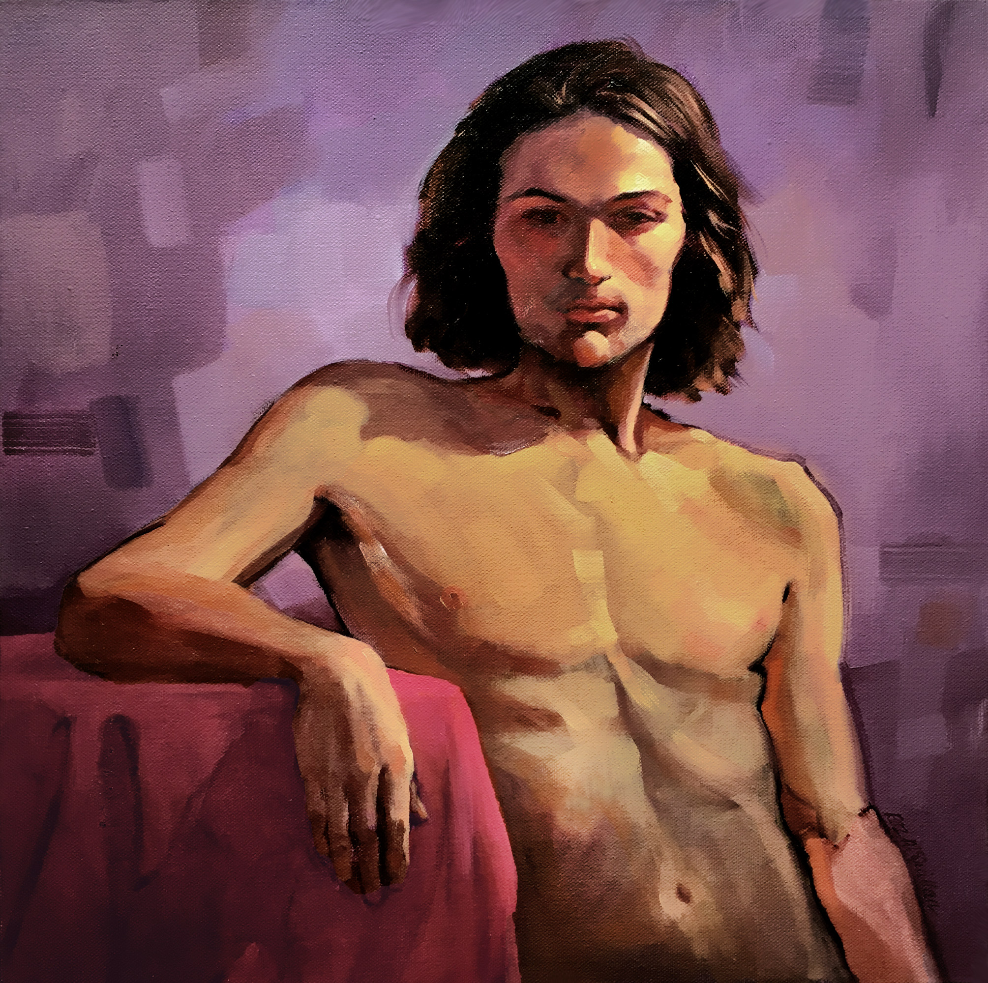 Original oil portrait of a young man, painted on stretched canvas, ready to hang. The figure is in flesh tones, Indian red and a little green. The background is abstracted shades of purple.
